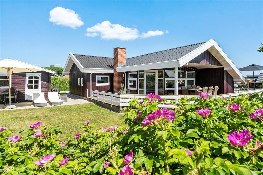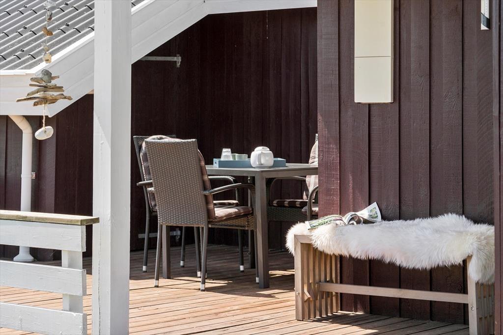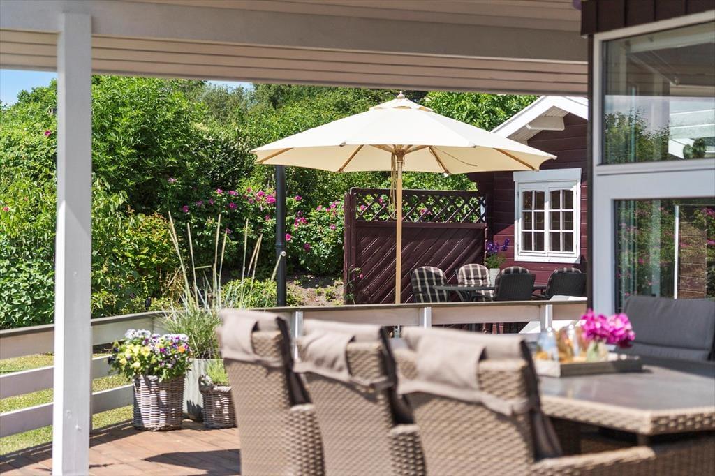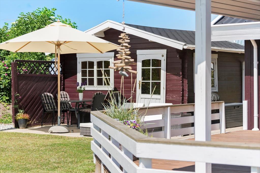 Das Haus ist von einer wunderschönen, leicht erhöhten Holzterrasse umgeben, die zu Entspannung an warmen Tagen oder zum gemütlichen Abendessen im Freien einlädt. Der Zugang zur Terrasse erfolgt direkt vom Wohnzimmer. Ideal, um ein Abendessen auf dem Grill zuzubereiten und es im Freien zu genießen. Auf der Terrasse finden Sie auch einen Sonnenschirm und Sitzkissen für zusätzlichen Komfort. Des Weiteren stehen zwei Sonnenliegen zur Verfügung – so ist es ganz leicht, in Urlaubsstimmung zu kommen in dem abgeschlossenen Garten.