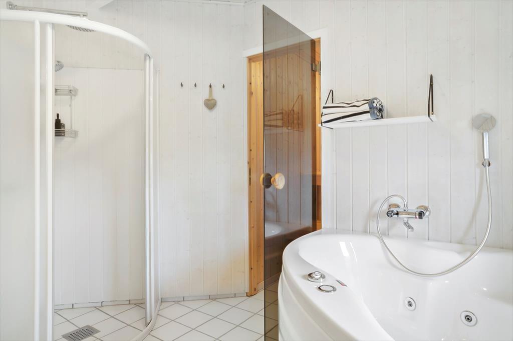 Das geräumige Badezimmer ist mit Dusche und Whirlpool-Badewanne ausgestattet. Zusätzlich gibt es eine Sauna mit ausreichend Sitzgelegenheit – hier ist der Komfort des hellen Badezimmers perfekt auf den Punkt gebracht.