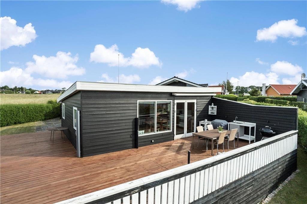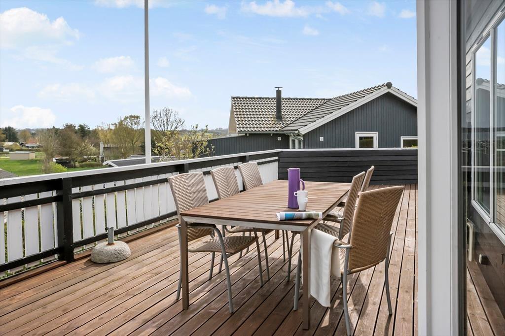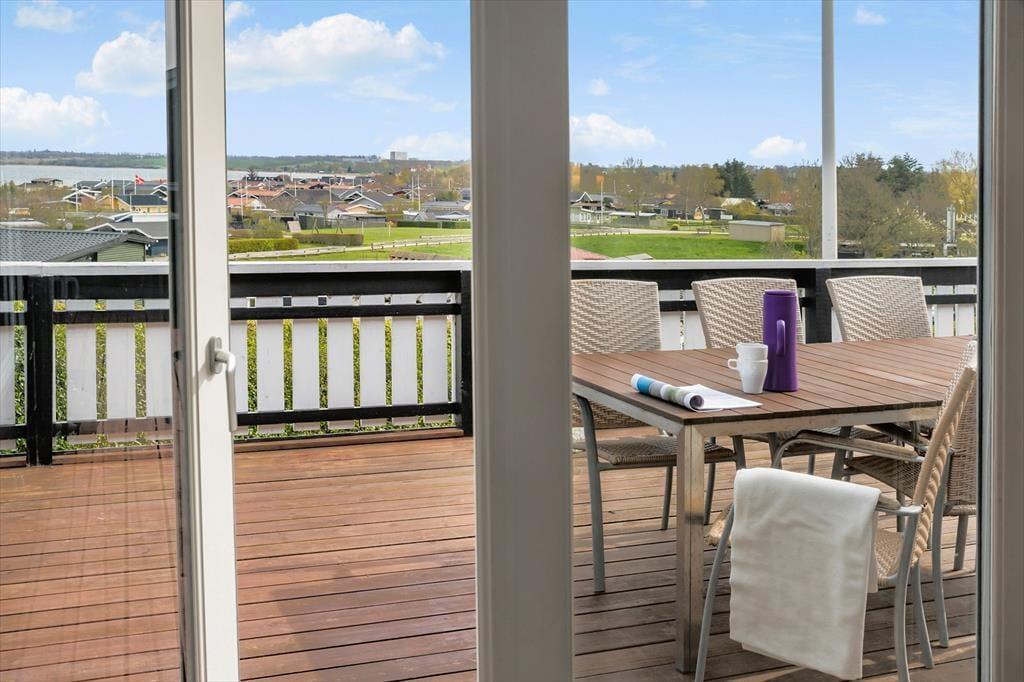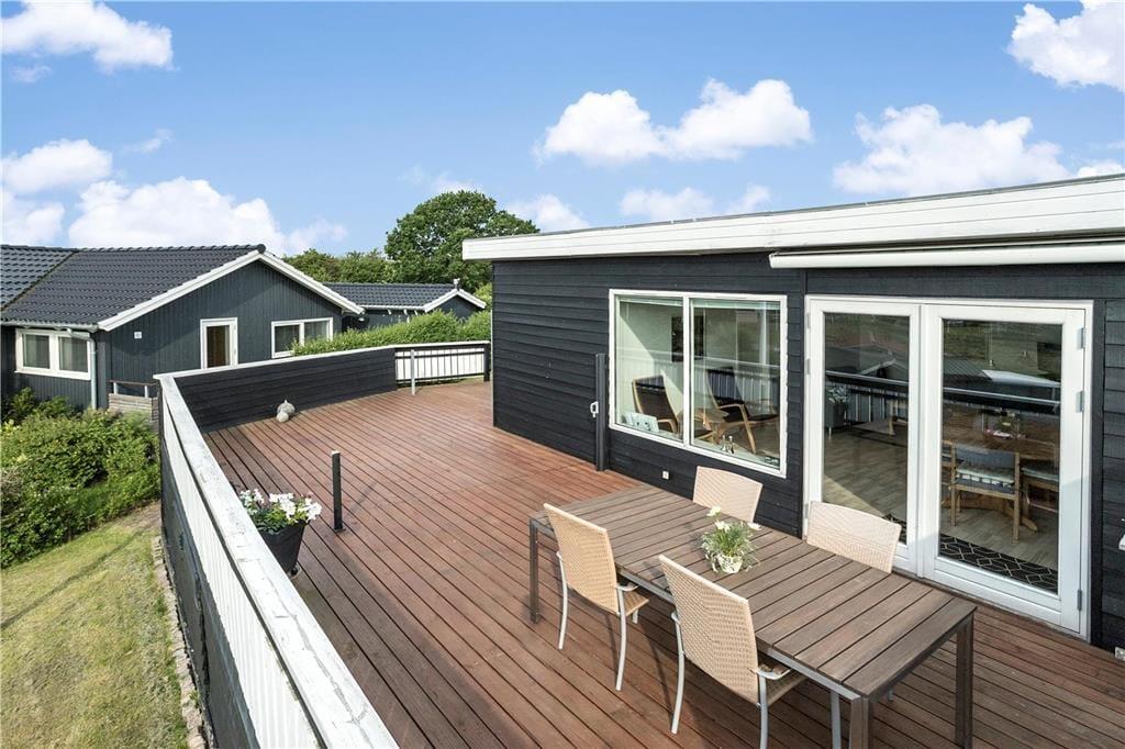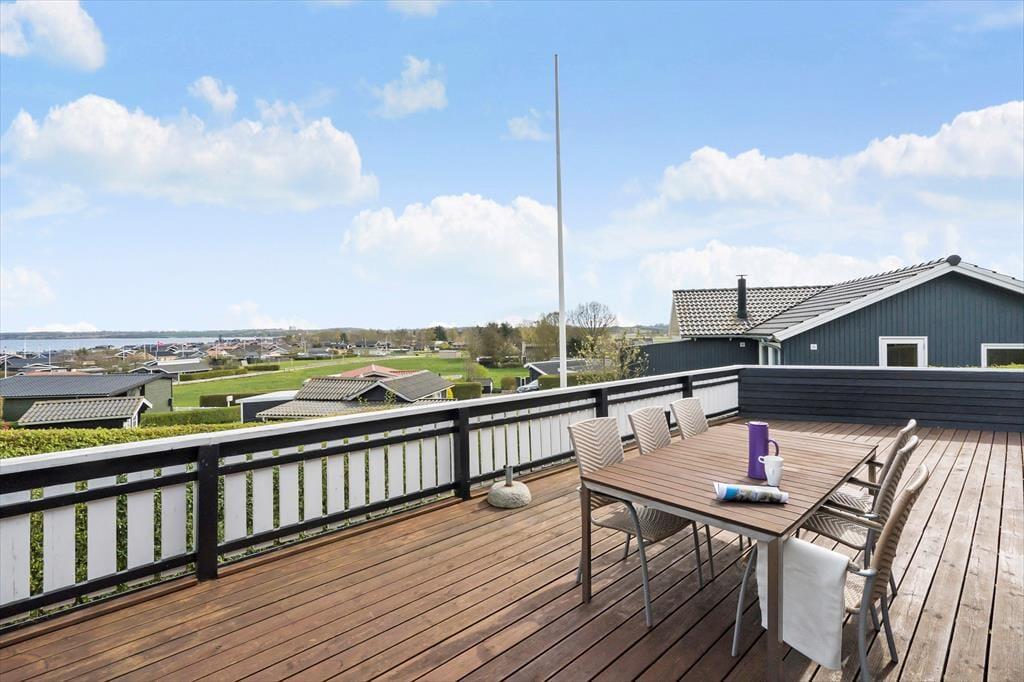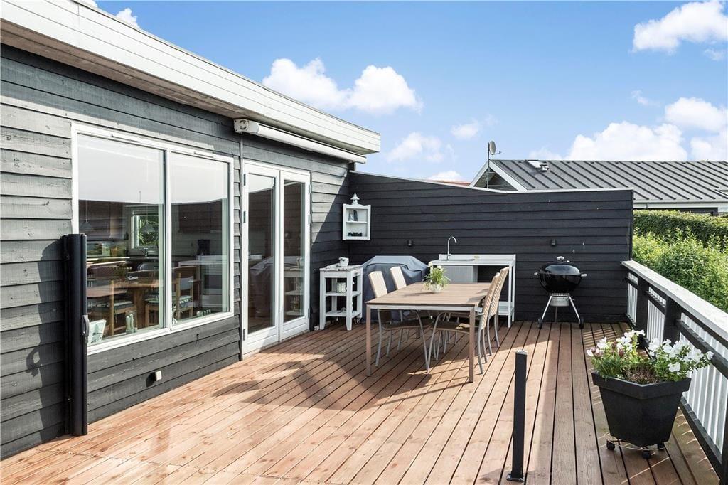 Das Ferienhaus ist von einer herrlichen Holzterrasse umgeben, von der Sie die prachtvolle Aussicht in vollen Zügen genießen können. Dank der Markise und des Windsegels bietet sich die Terrasse nahezu den gesamten Tag über als sehr schöner Aufenthaltsort an. Auf der Terrasse steht außerdem eine Außenküche mit fließend, kaltem Wasser für Sie bereit.