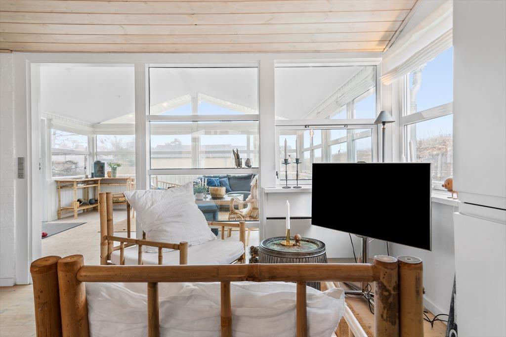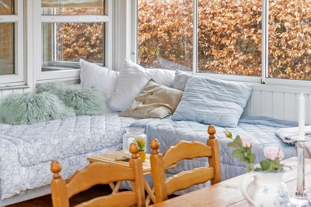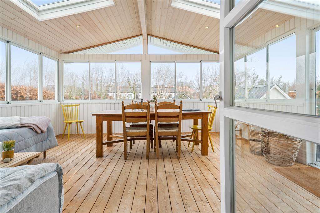 Das Ferienhaus verfügt über ein helles und einladendes Wohnzimmer, das zur Küche hin offen ist. Im Wohnzimmer können Sie es sich vor dem Holzofen gemütlich machen und das schöne Licht des Gartens genießen, oder Sie versammeln die Familie zu einem Brettspiel oder einem guten Essen. Vom Wohnzimmer aus gibt es einen direkten Zugang zum gemütlichen Wintergarten, der dazu beiträgt, die Sommermonate bis in den Herbst hinein zu verlängern. Außerdem verfügt das Ferienhaus über zwei gute Schlafzimmer und ein schönes Badezimmer.