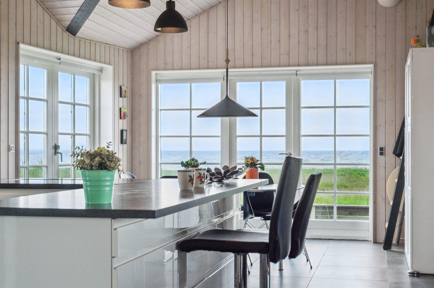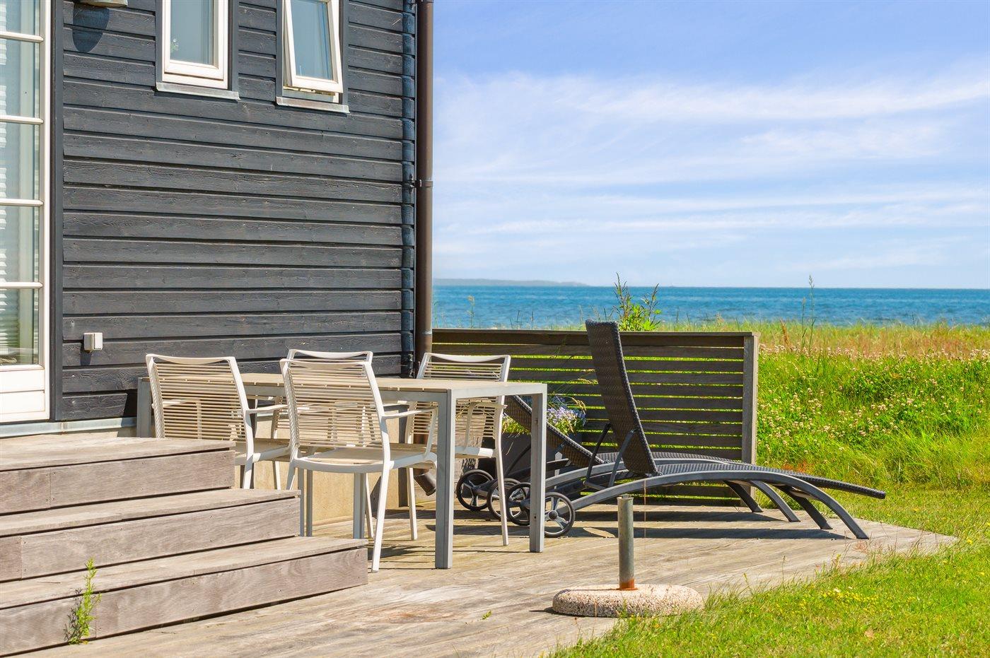 Es gibt 180-Grad-Panoramaaussicht auf das Wasser, und es ist schwer, sich von diesem Anblick loszureißen. Dies gilt sowohl von der schönen Terrassenfläche, die das ganze Haus umgibt und wo es immer einen vor dem Wind geschützten Platz gibt, als auch vom Inneren des Hauses.