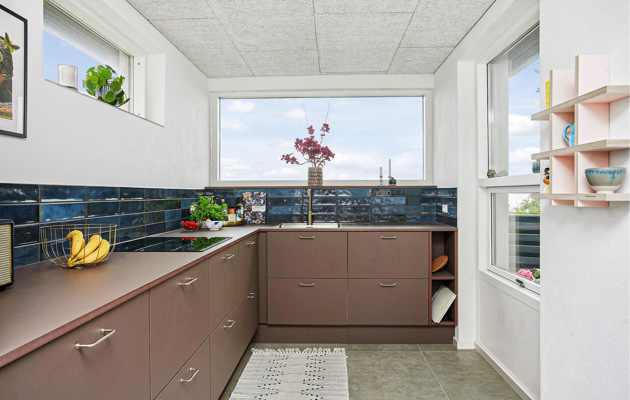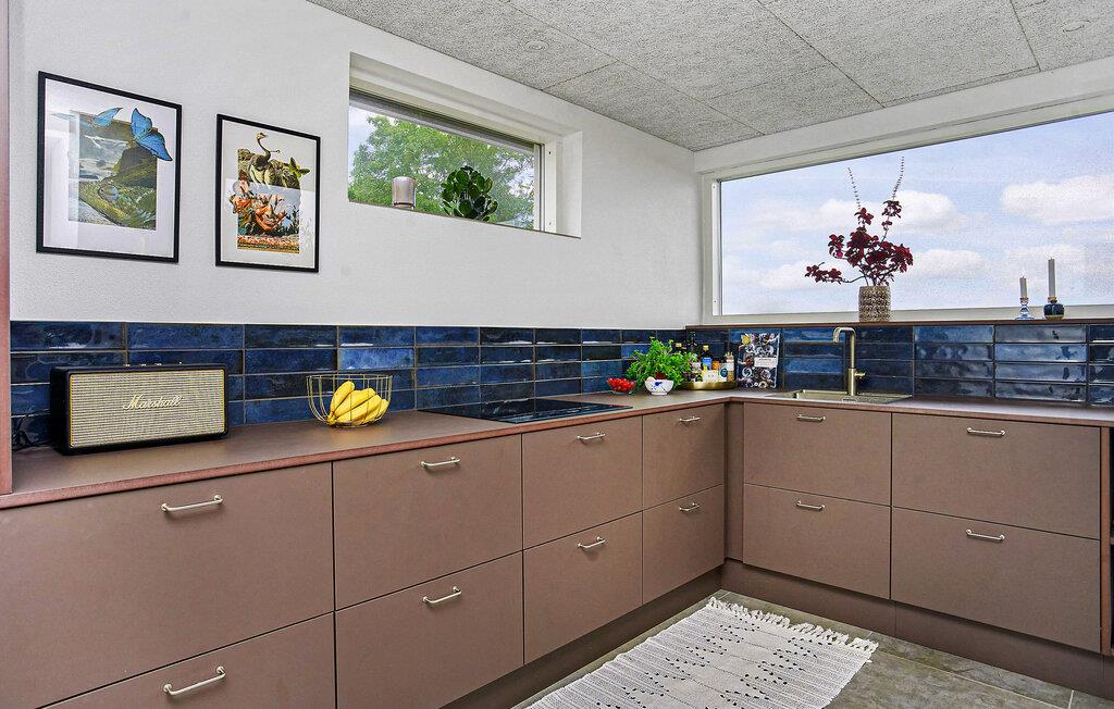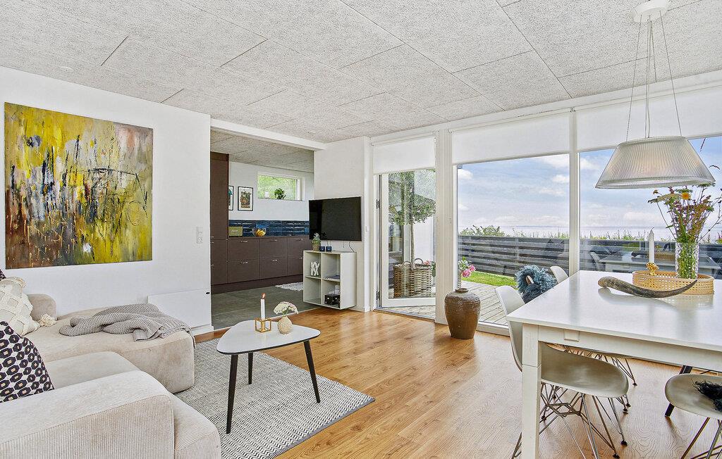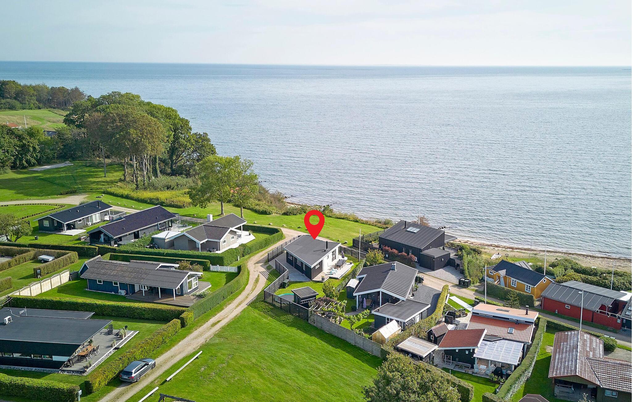 Dieses Ferienhaus ist wie gemacht für Gäste, die skandinavisches Design, entspannte Atmosphäre und eine direkte Nähe zum Meer schätzen. Freuen Sie sich auf die moderne Architektur, die großen Fensterfronten und das durchdachte Innendesign, die ein helles, luftiges Wohngefühl mit Blick auf das Wasser schaffen. Der offene Wohnbereich verbindet Küche, Essplatz und Sofaecke zu einem harmonischen Ganzen. Die Küche ist modern gestaltet und bietet viel Platz zum Zubereiten der gemeinsamen Mahlzeiten. Genießen Sie vom Esstisch aus den Ausblick ins Grüne oder aufs Meer. Der gemütliche Kaminofen sorgt auch an kühleren Tagen für eine behagliche Atmosphäre.
