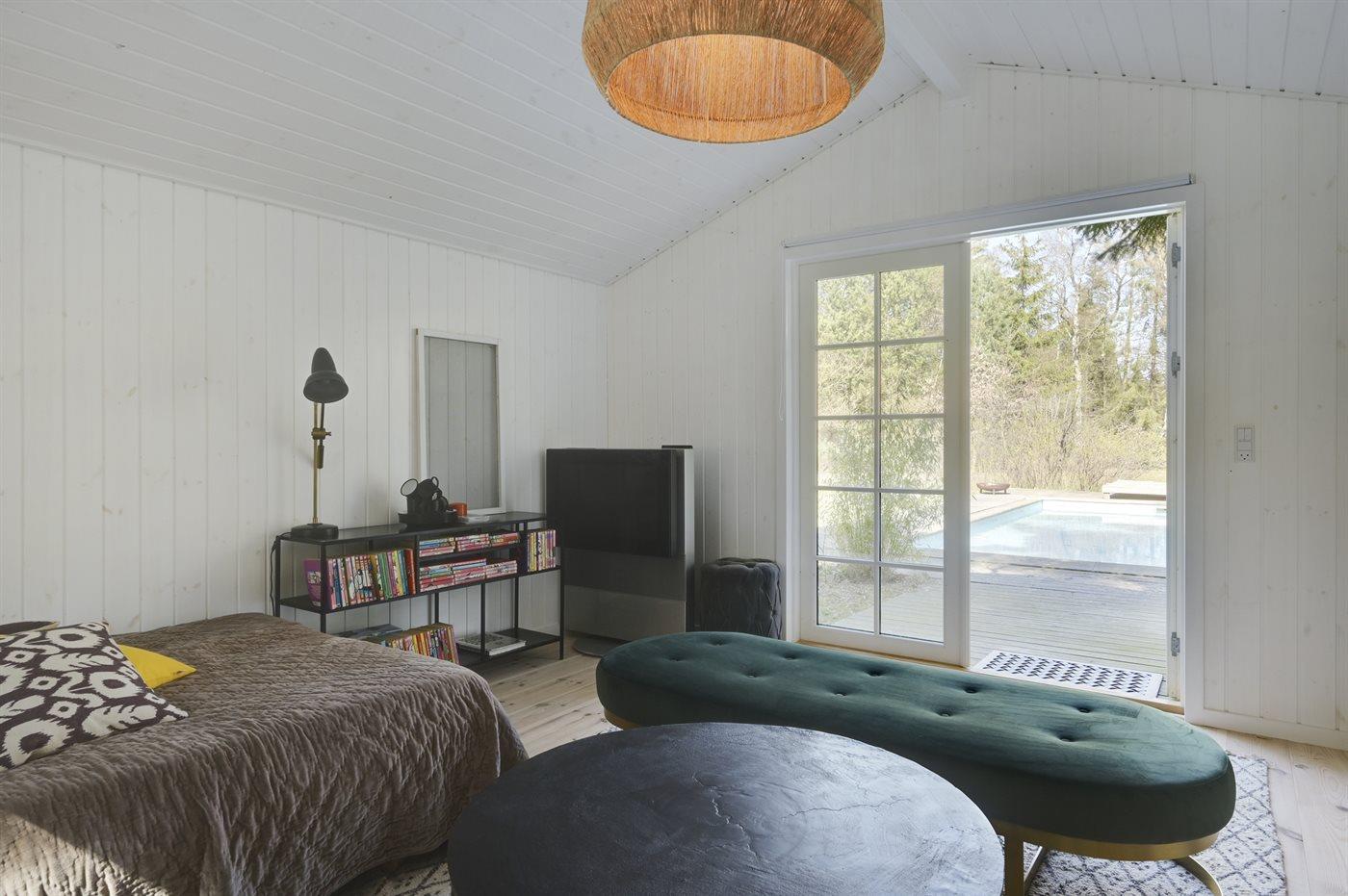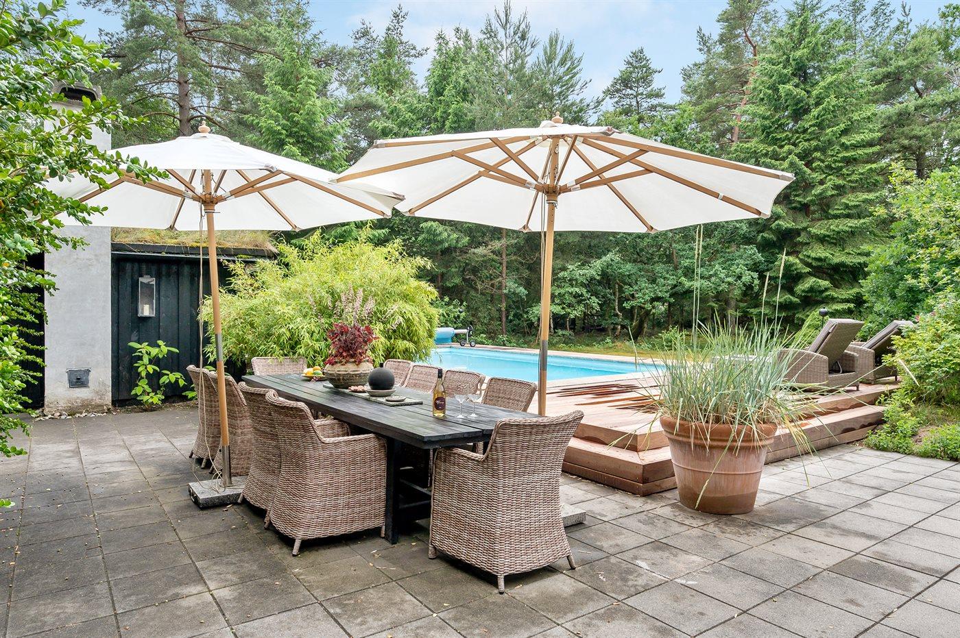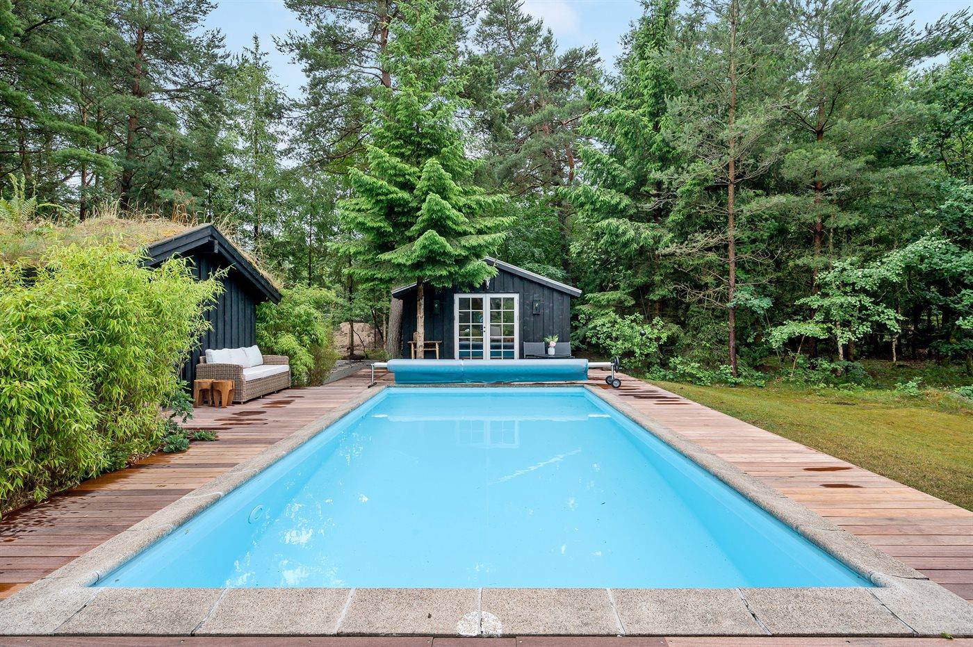 Auf einem großen, von hohen Bäumen umgebenen Grundstück, finden Sie dieses schöne Ferienhaus und 2 dazugehörende Gästehäuser. Es stehen große Terrassen, ein Badehaus mit u. a. Sauna und ein großer Außen-Swimmingpool (8 x 4 m) zur Verfügung. Der Swimmingpool ist im Zeitraum von der 22 KW bis zu einschl. 35 KW nutzbar. Zusätzlich zu dem schönen Ferienhaus gibt es 2 Gästehäuser mit Ausblick auf den Swimmingpool. Das eine ist mit Schlafzimmer mit Doppelbett und Badezimmer eingerichtet und das andere mit Doppelbett. Eine echte Ferienperle – hier können Sie sich vom Alltag erholen und es sich mit der Familie oder mit Freunden gemütlich machen.