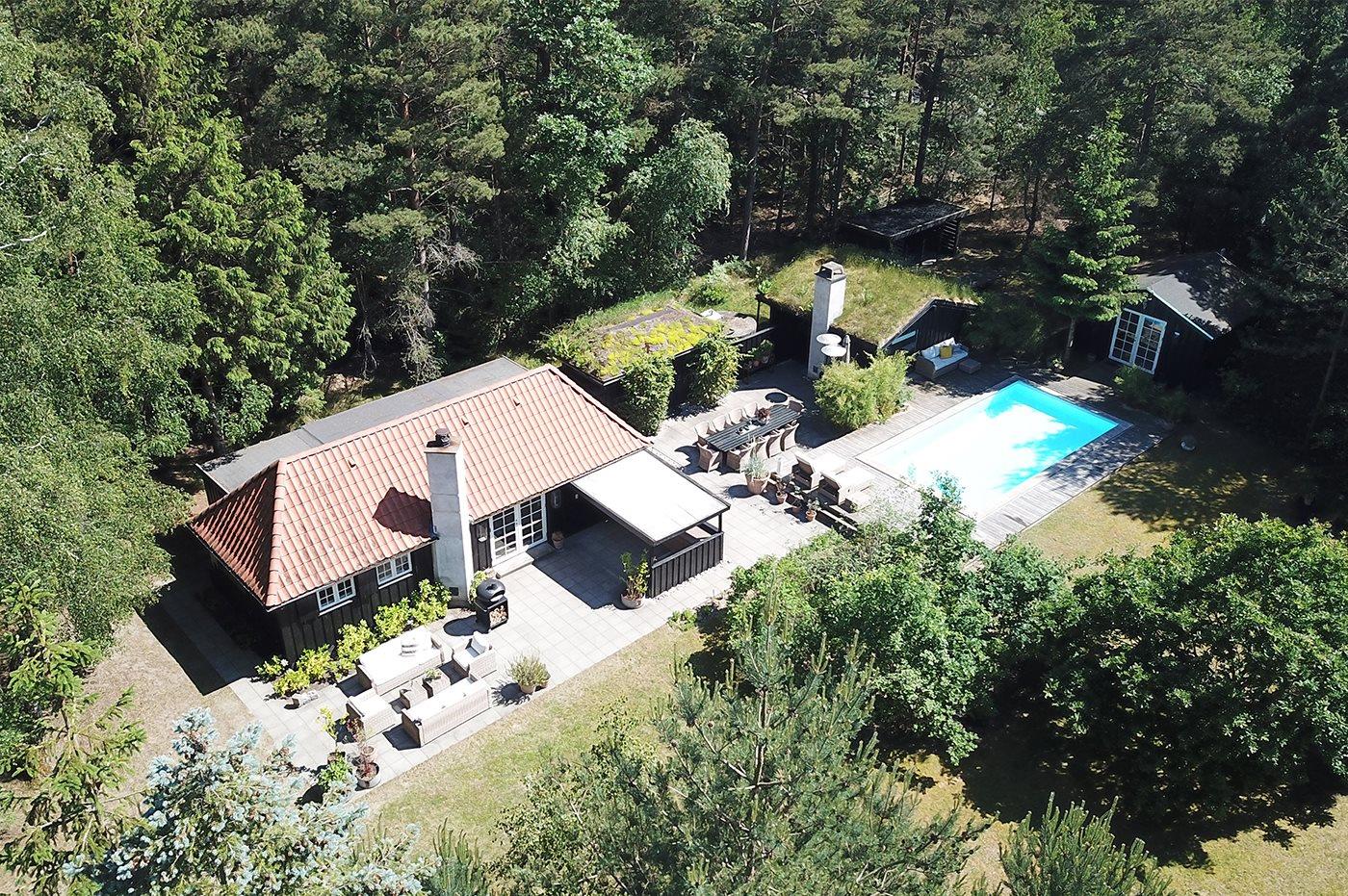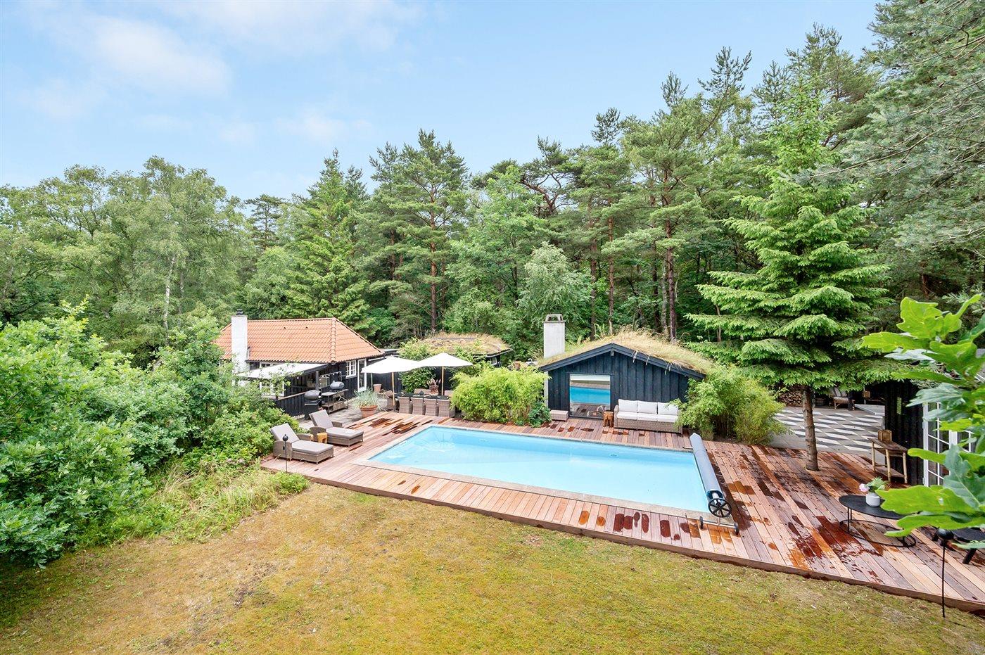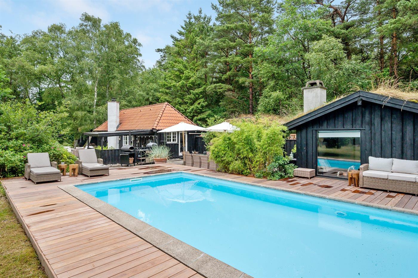 Ferienhaus mit Sauna, Pool und Gästehäusern in Dänemark, ideal für Erholung und Komfort.