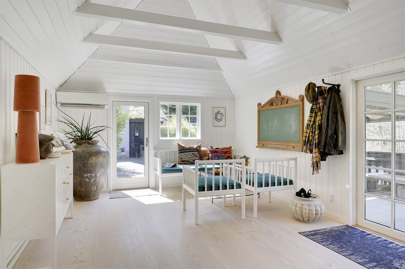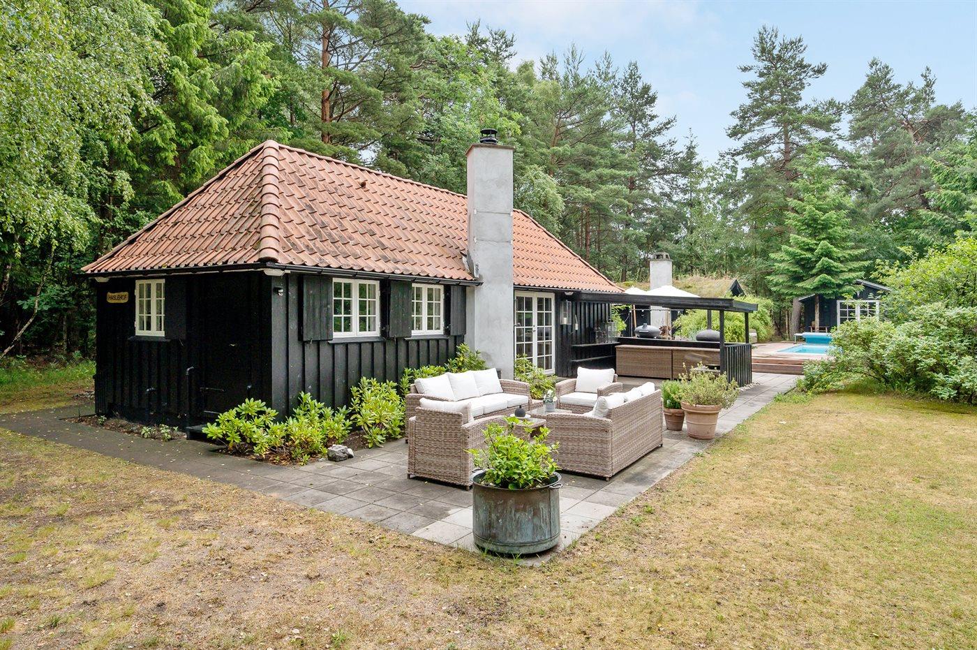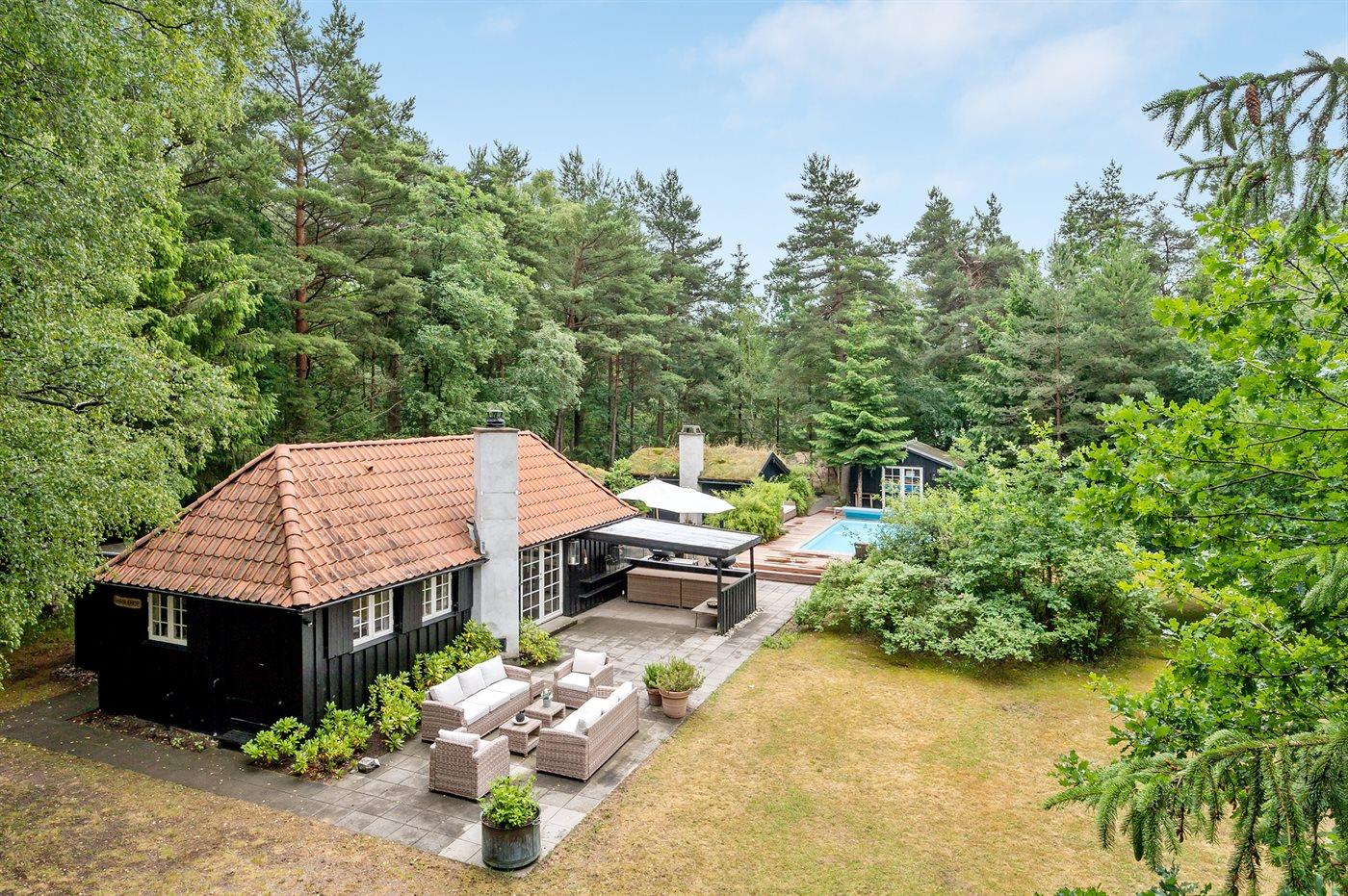 Ferienhaus mit Sauna, Pool und Gästehäusern in Dänemark, ideal für Erholung und Komfort.