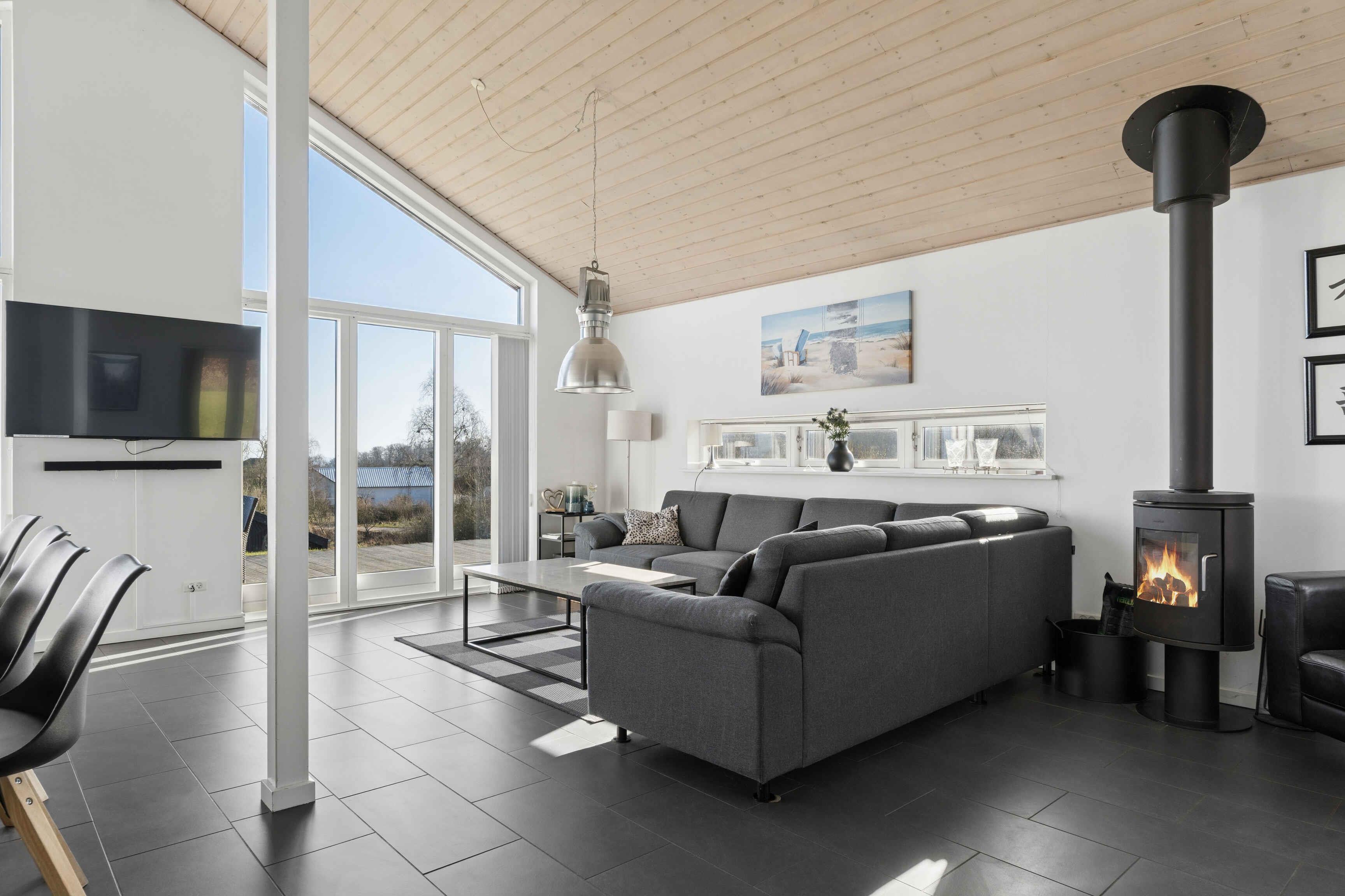 Modernes Ferienhaus mit Meerblick, Spa, Kaminofen und Platz für die ganze Familie in ruhiger Lage nahe Kiesstrand.