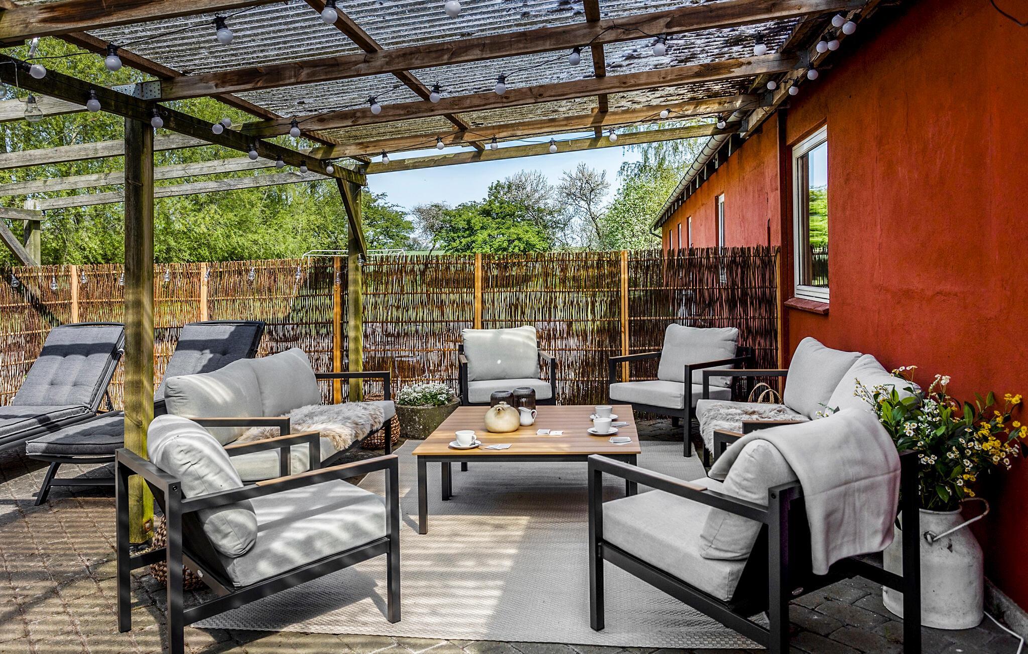Verbringen Sie auch entspannte Stunden im geschützten Innenhof mit Lounge-Möbeln oder nehmen Sie Platz an den langen Tischen auf der überdachten Terrasse. Genießen Sie die Sonne auf den Liegen oder beobachten Sie die Kinder beim Spielen auf dem großzügigen Gelände mit Rutsche, Trampolin und Platz für Ballspiele. Das große Grundstück wird gemeinsam mit dem Haupthaus genutzt und bietet weite Ausblicke über Felder, Wald und bis zum Langelandsbælt.