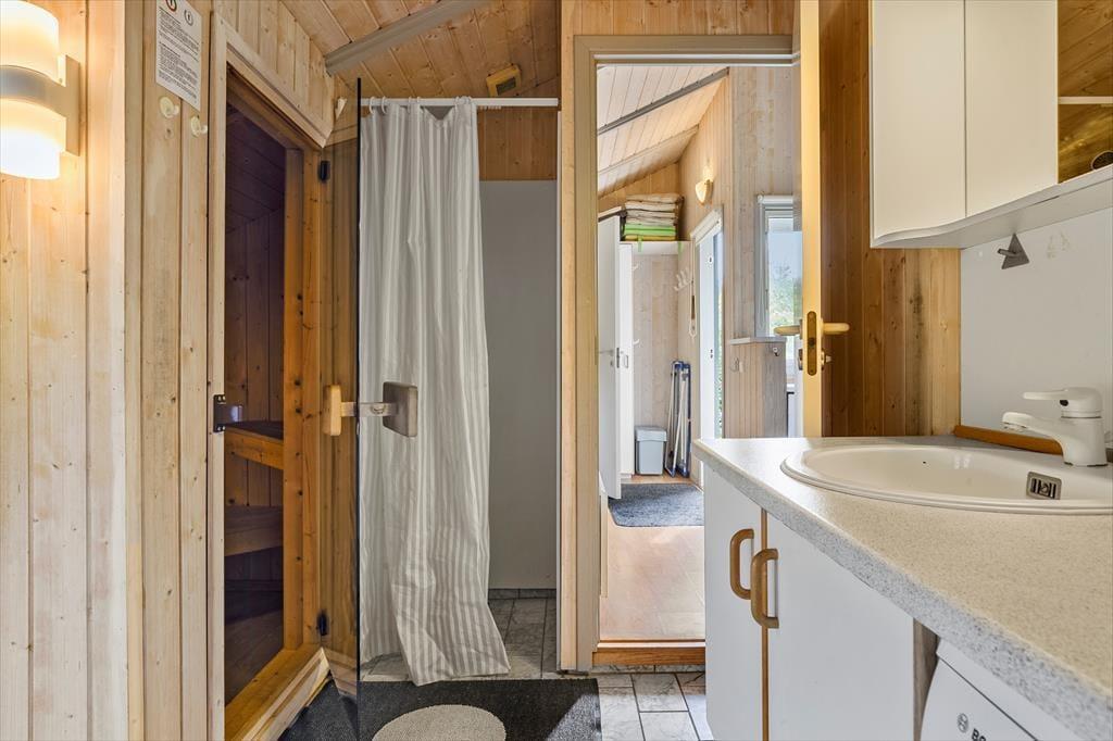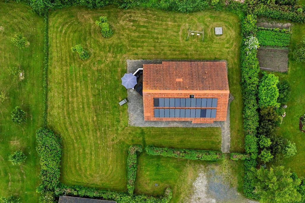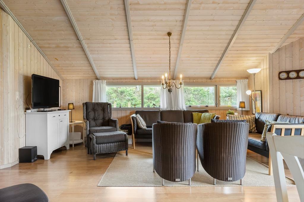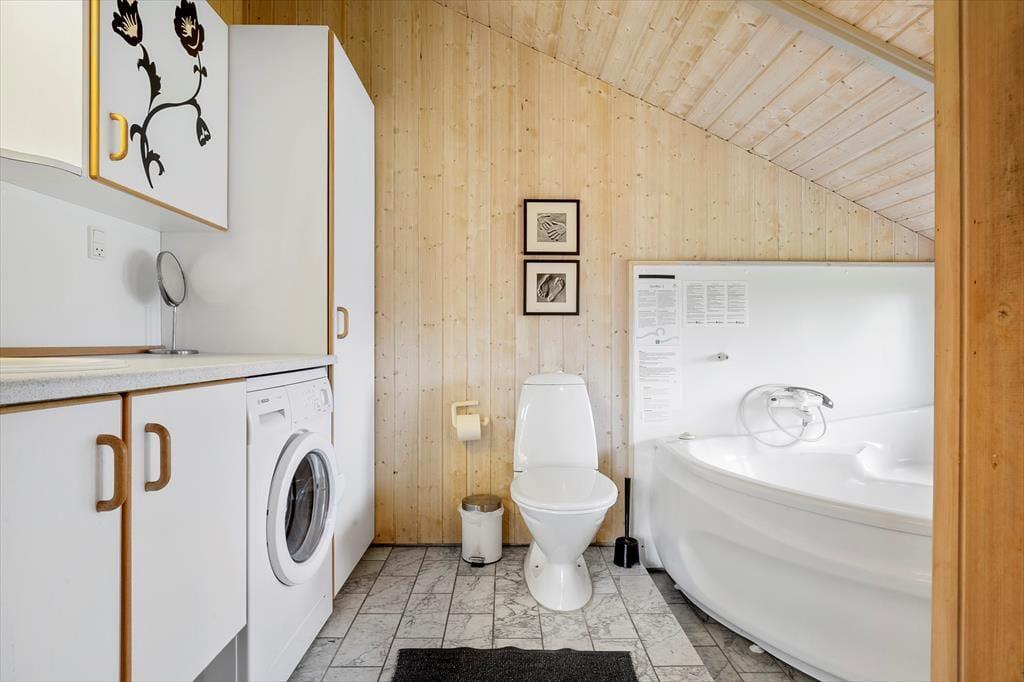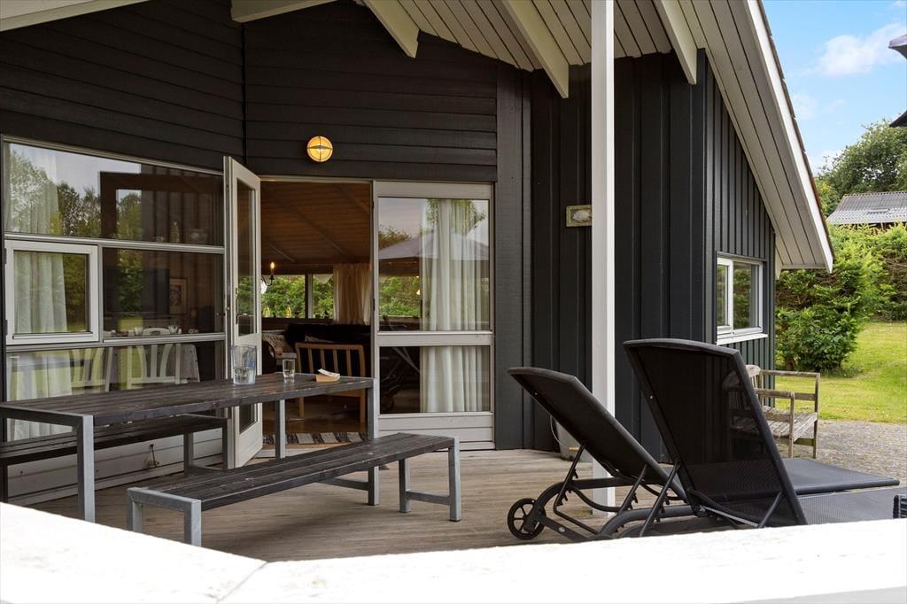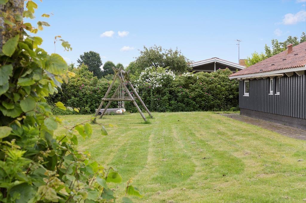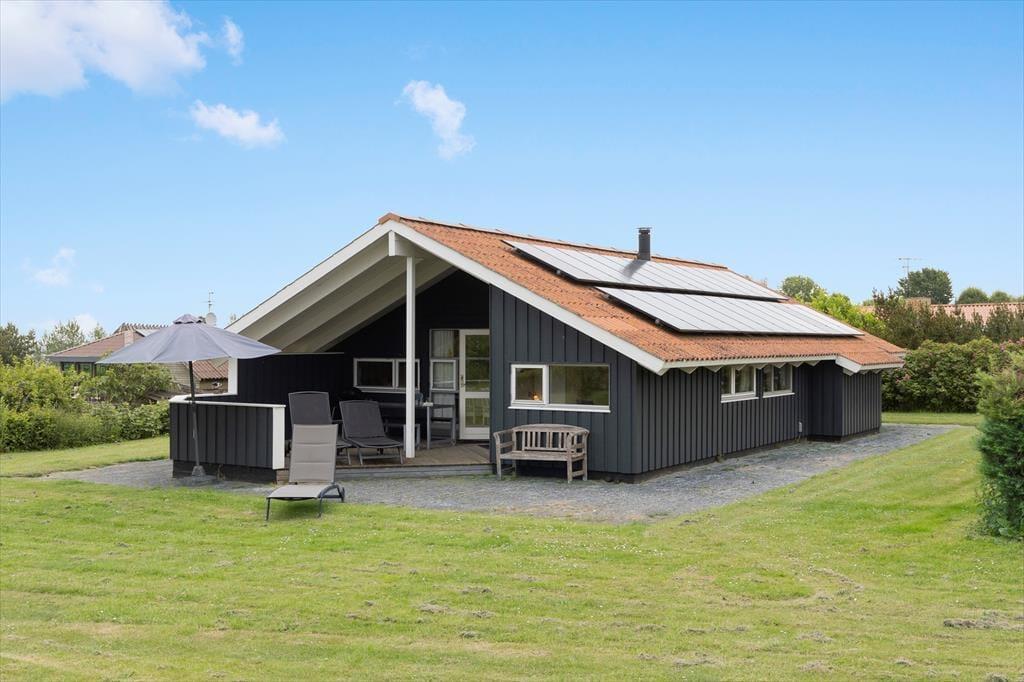 Draußen erwartet Sie ein großzügiger und gepflegter Garten, der sowohl zum Spielen als auch zum Entspannen einlädt. Die große Holzterrasse ist teilweise überdacht und mit Gartenmöbeln, Liegestühlen und Grill ausgestattet – ideal für lange Sommertage mit Mahlzeiten unter freiem Himmel. Die Terrasse ist westlich ausgerichtet, sodass Sie bei einem Glas Wein den Sonnenuntergang genießen können, während die Kinder im Garten spielen. Hier ist Platz für Ballspiele ebenso wie für ruhige Momente mit einem guten Buch. Die Lage in einer ruhigen Sackgasse macht das Gebiet sicher für Kinder und angenehm ruhig für Erwachsene. Nur etwa 300 Meter vom Haus entfernt finden Sie einen schönen Sandstrand mit flachem Wasser – perfekt für Familien mit Kindern oder alle, die das Meer lieben. Nach dem Strandbesuch können Sie sich bequem auf der Terrasse die Füße abspülen, den Grill anwerfen und den Tag in guter Gesellschaft ausklingen lassen.