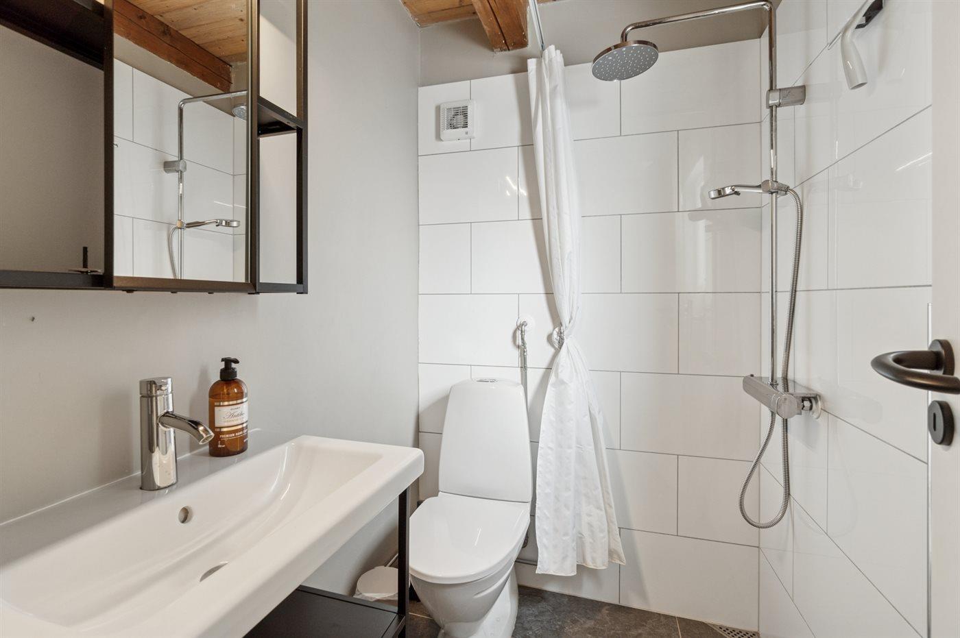Es gibt 1 Badezimmer mit Duschnische und 2 Toiletten, davon 1 Gästetoilette. Fußbodenheizung in 1 Badezimmer.