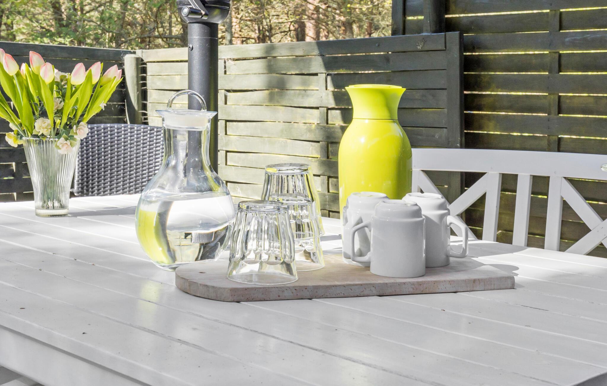 Bei schönem Wetter können Sie sich auf die große Terrasse mit Gartenmöbeln und Grill setzen, wo Sie sowohl Sonne als auch Schatten finden. Um das Haus herum gibt es ein schönes Grundstück, auf dem dem Sie dem Vogelgezwitscher lauschen und die Ruhe genießen können.