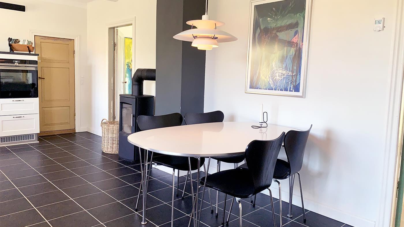 Im Erdgeschoss befindet sich eine große Küche mit reichlich Arbeitsfläche, sodass Sie leckere Mahlzeiten zubereiten können. In der Küche gibt es 2 Öfen, von denen einer ein Kombi-Ofen mit Mikrowelle ist. Am Esstisch in der Küche kann man einen schnellen Snack genießen. An kühlen Abenden und für Gemütlichkeit kann man den Holzofen in der Küche anzünden. An die Küche grenzt das Esszimmer, in dem die ganze Familie bequem am langen Tisch Platz findet. Während die Erwachsenen noch das Abendessen genießen, können sich die Jüngsten ins Wohnzimmer setzen und ihre Lieblingssendungen über Chromecast auf dem Fernseher streamen. Im Erdgeschoss gibt es 1 Badezimmer mit Duschkabine sowie eine Waschküche mit Hauswirtschaftsraum. Vom Wohnzimmer aus gelangt man auf die Terrasse, die nach Osten ausgerichtet ist und auf der man die Morgensonne genießen kann. Es gibt auch einen großen Gemeinschaftsraum mit Zugang zur Terrasse im Süden, wo man sowohl morgens als auch abends die Sonne genießen kann.