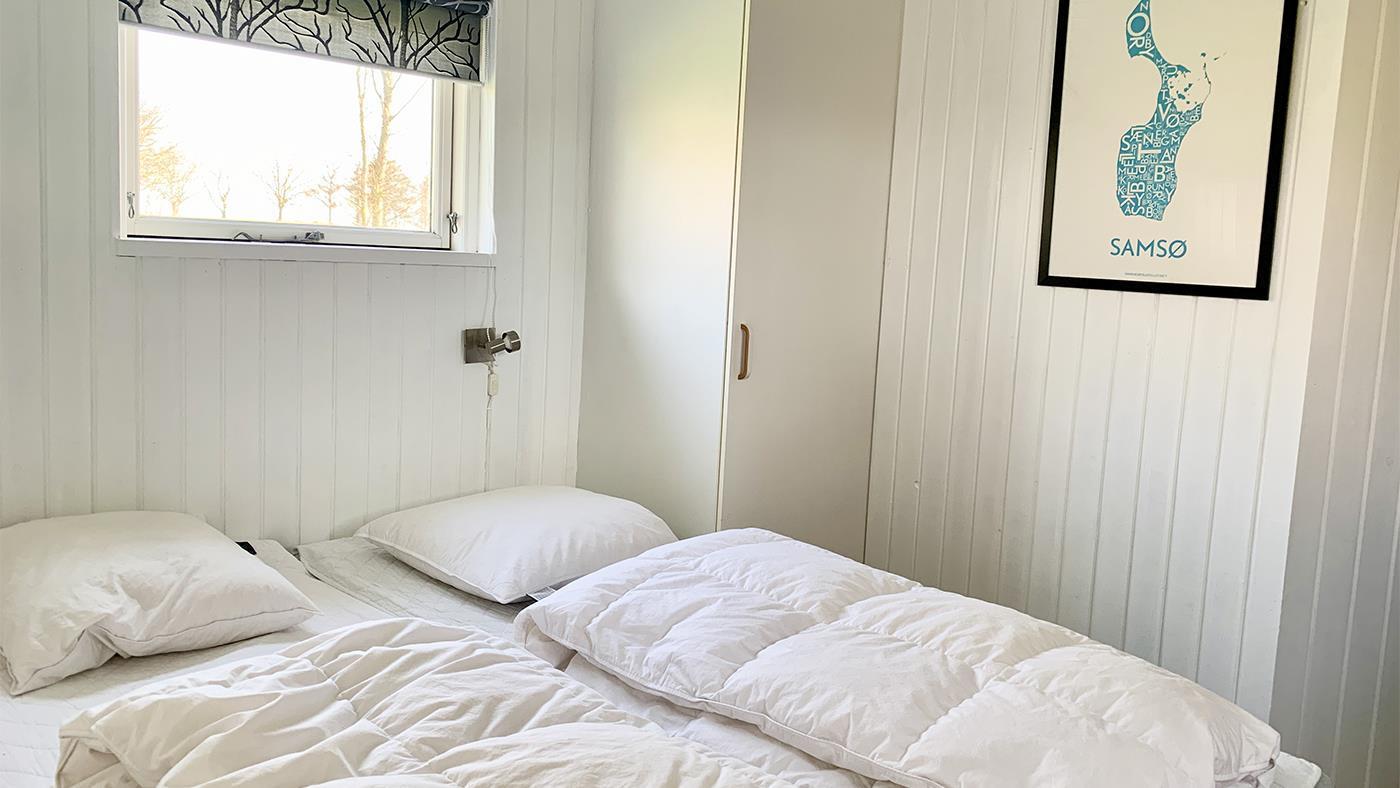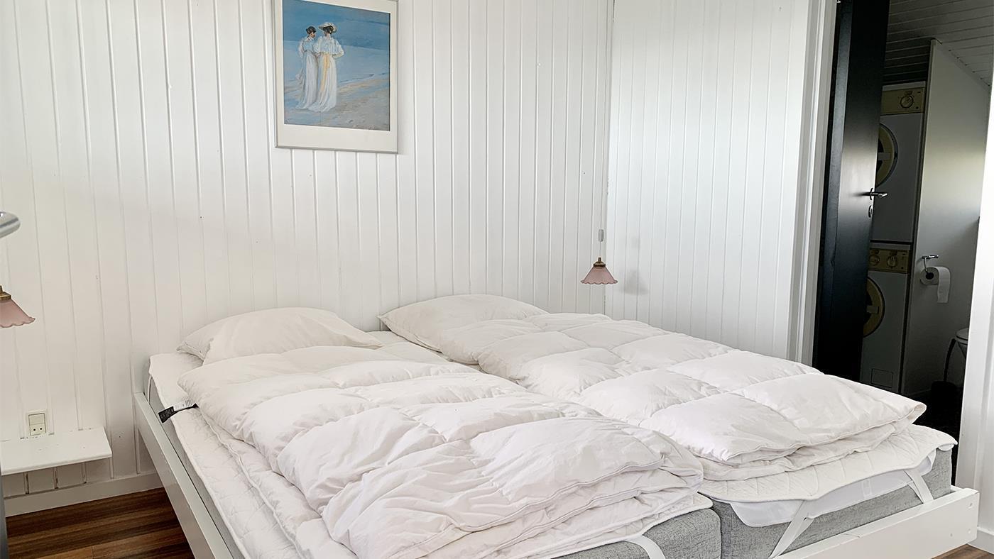 Das Ferienhaus verfügt über drei helle Schlafzimmer – alle mit Doppelbetten. In unmittelbarer Verbindung zu einem der Schlafzimmer befindet sich ein kleines Badezimmer mit Waschmaschine und Trockner. Das große Badezimmer befindet sich am Eingang und verfügt über eine Duschkabine, eine Toilette, ein Waschbecken, eine Badewanne und eine Sauna – perfekt nach einem aktiven Tag auf der Insel.