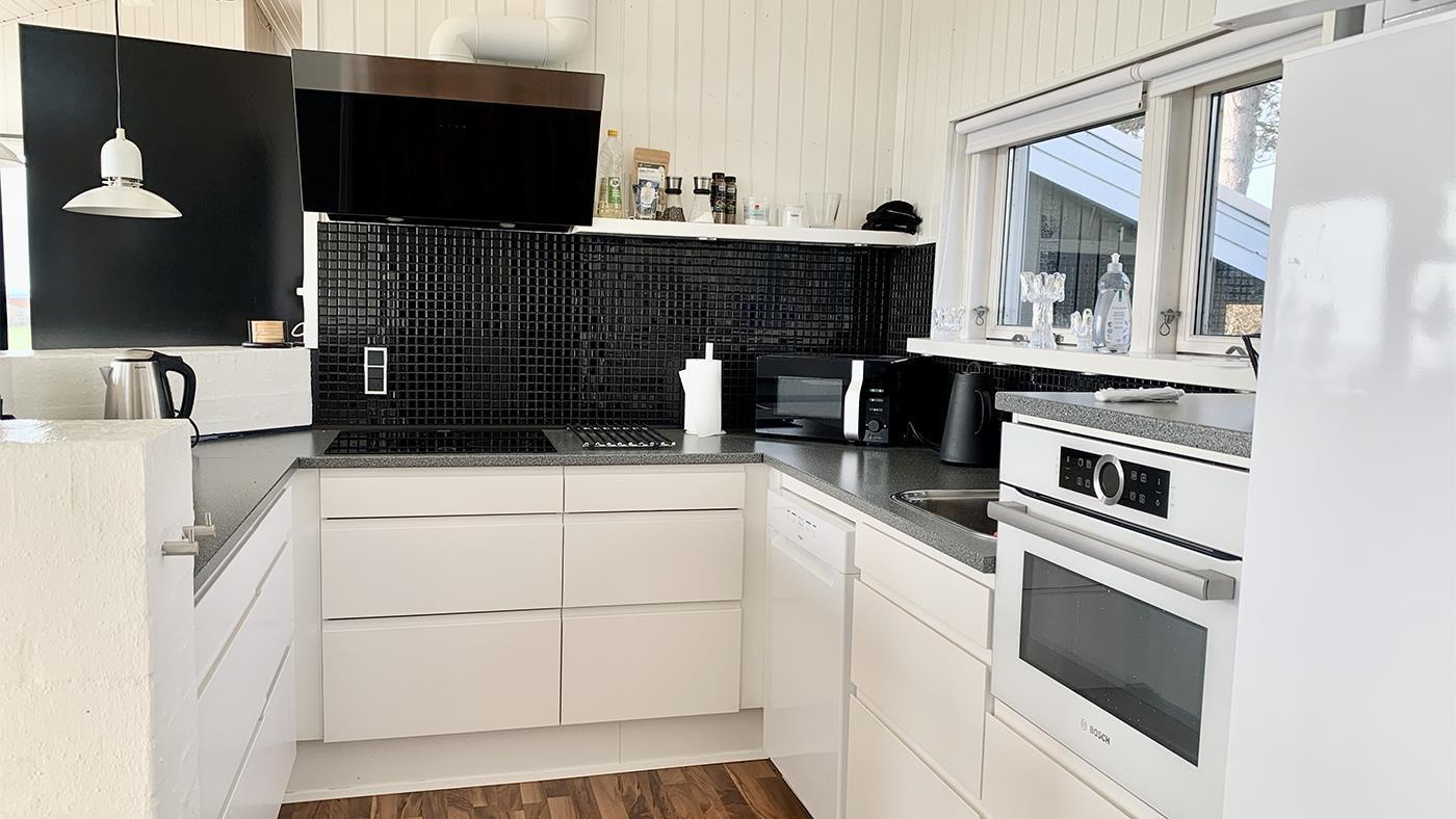 Genießen Sie Ihren Urlaub in einem schönen und gut ausgestatteten Ferienhaus auf einem großen, sonnigen Grundstück mit herrlichem Meerblick. Hier finden Sie eine geräumige Wohnküche mit einem schönen Essbereich, einer gemütlichen Sofagruppe im Fernsehbereich und großen, nach Osten ausgerichteten Fenstern, die viel Licht hereinlassen. Von allen Fenstern im Wohnbereich aus können Sie Ihren Blick über das Wasser und das grüne Grundstück schweifen lassen.