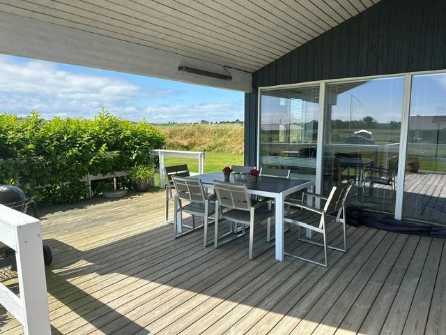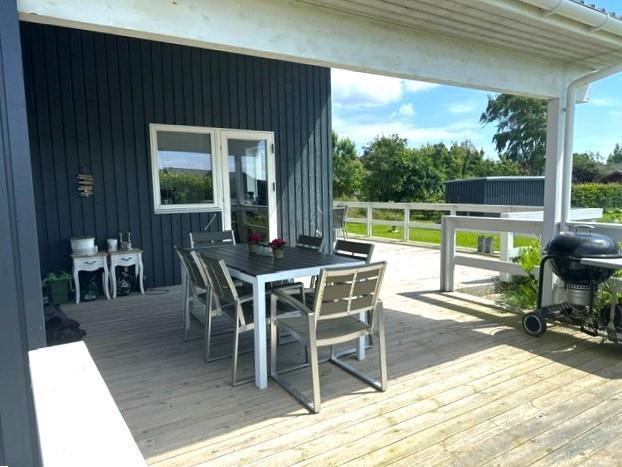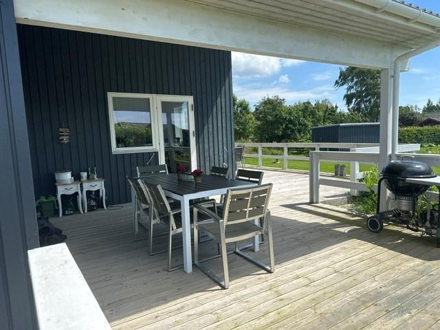 Vom Wohnzimmer aus haben Sie direkten Zugang zu einer großen, teilweise überdachten Holzterrasse mit guten Gartenmöbeln und Grill – perfekt für gemütliche Abendessen und entspannte Abende unter freiem Himmel.