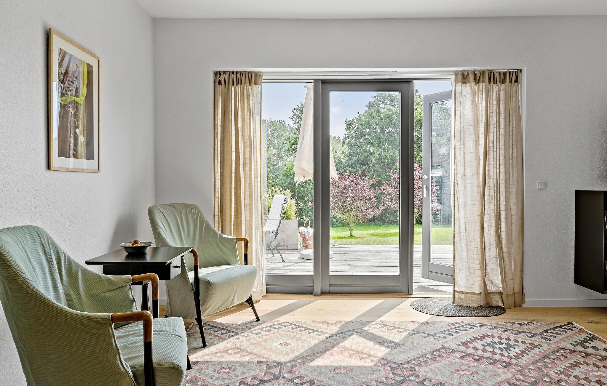 Moderne Ferienwohnung mit Terrasse und Blick auf den Golfplatz auf Samsø, ideal für Erholung und Familienurlaub.