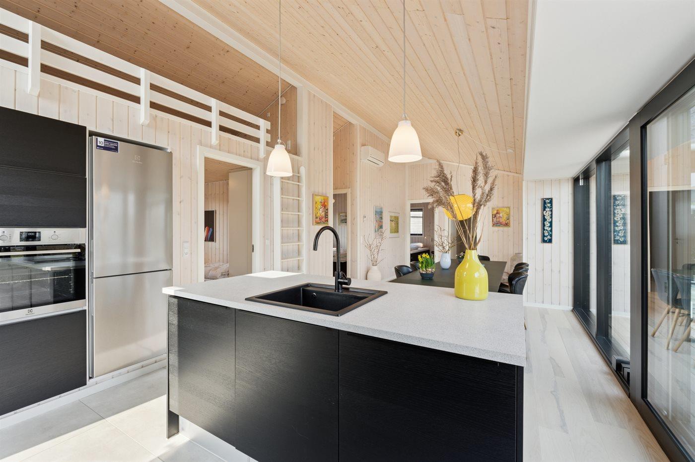 Die Küche ist mit Kühlschrank ausgestattet. Außerdem gibt es 4 Induktions-Kochzonen, Umluftofen, Mikrowelle sowie Geschirrspüler.
