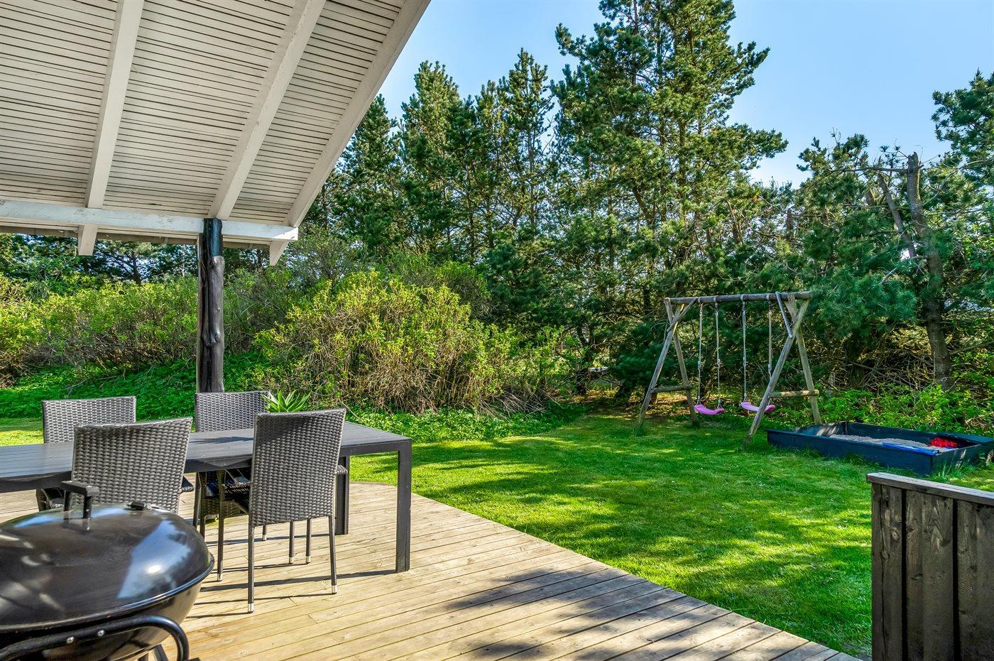 Die Ferienunterkunft liegt auf einem 1366 m² großen Gartengrundstück. Die Entfernung zum Meer beträgt 700 m. Die Entfernung zum Fjord beträgt 1700 m. Die nächste Einkaufsmöglichkeit liegt 1500 m entfernt. In einem Abstand von 1200 m gibt es einen Golfplatz. Es steht ein offenes Terrassenareal zur Verfügung. Außerdem gibt es überdachte Terrasse. Schaukel. Sandkasten. Trampolin. Fußballtor. Tischtennis. Kleine Rutsche. Es steht ein Grill zur Verfügung. Es ist ein Ladestecker für Elektroautos installiert. Ladestecker Typ 2. Mit einer Ladeleistung von 11 kW. Parkplatz auf dem Grundstück.