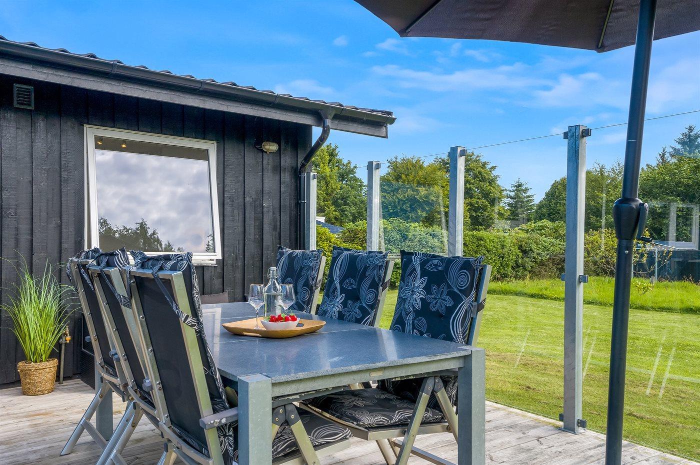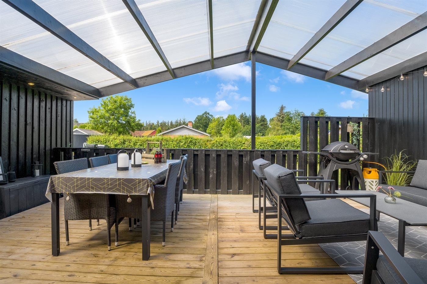 Gemütliches Ferienhaus mit überdachter Terrasse, Kamin und großem Garten in Hals, Dänemark, ideal zum Entspannen und Genießen.