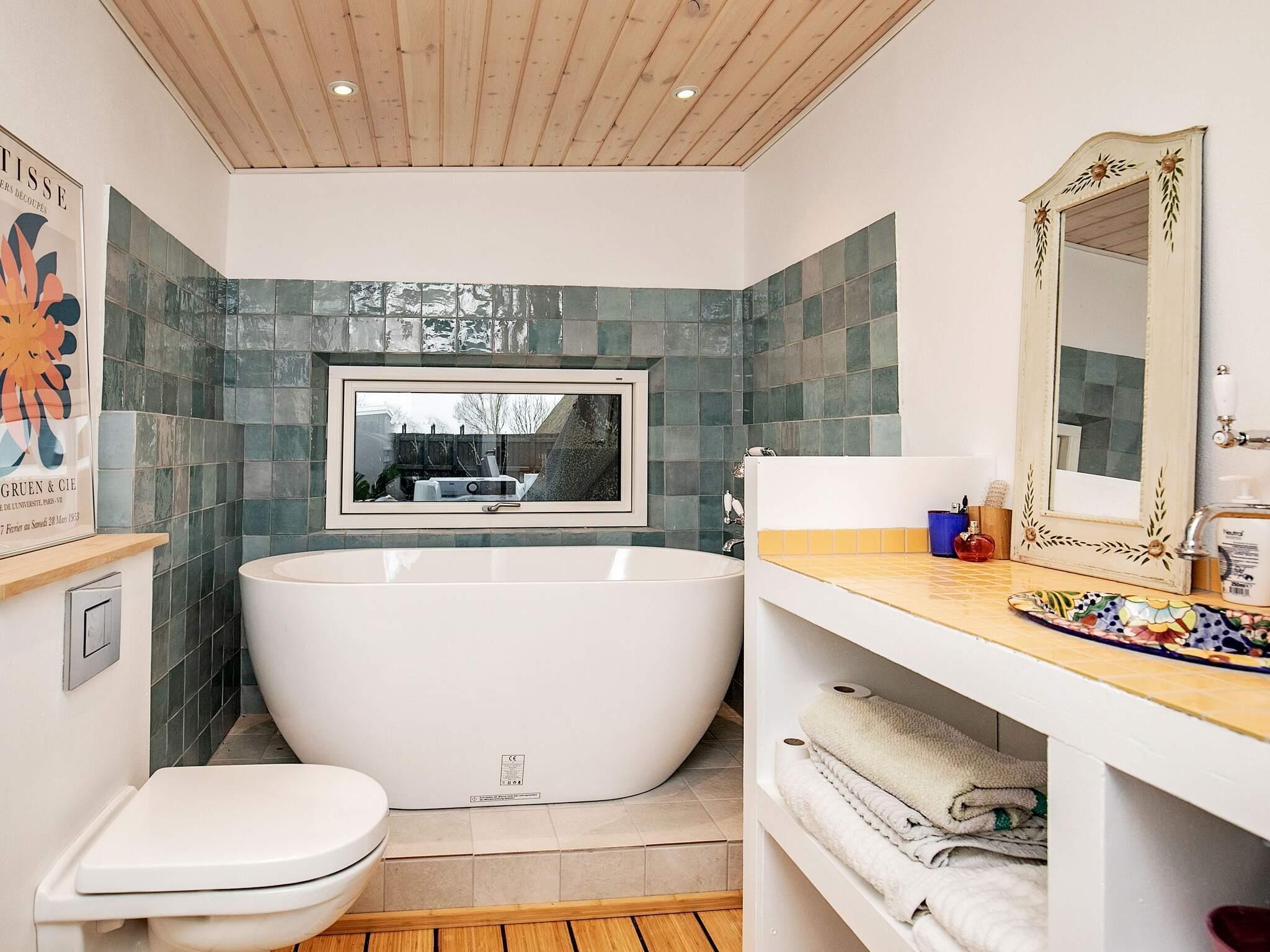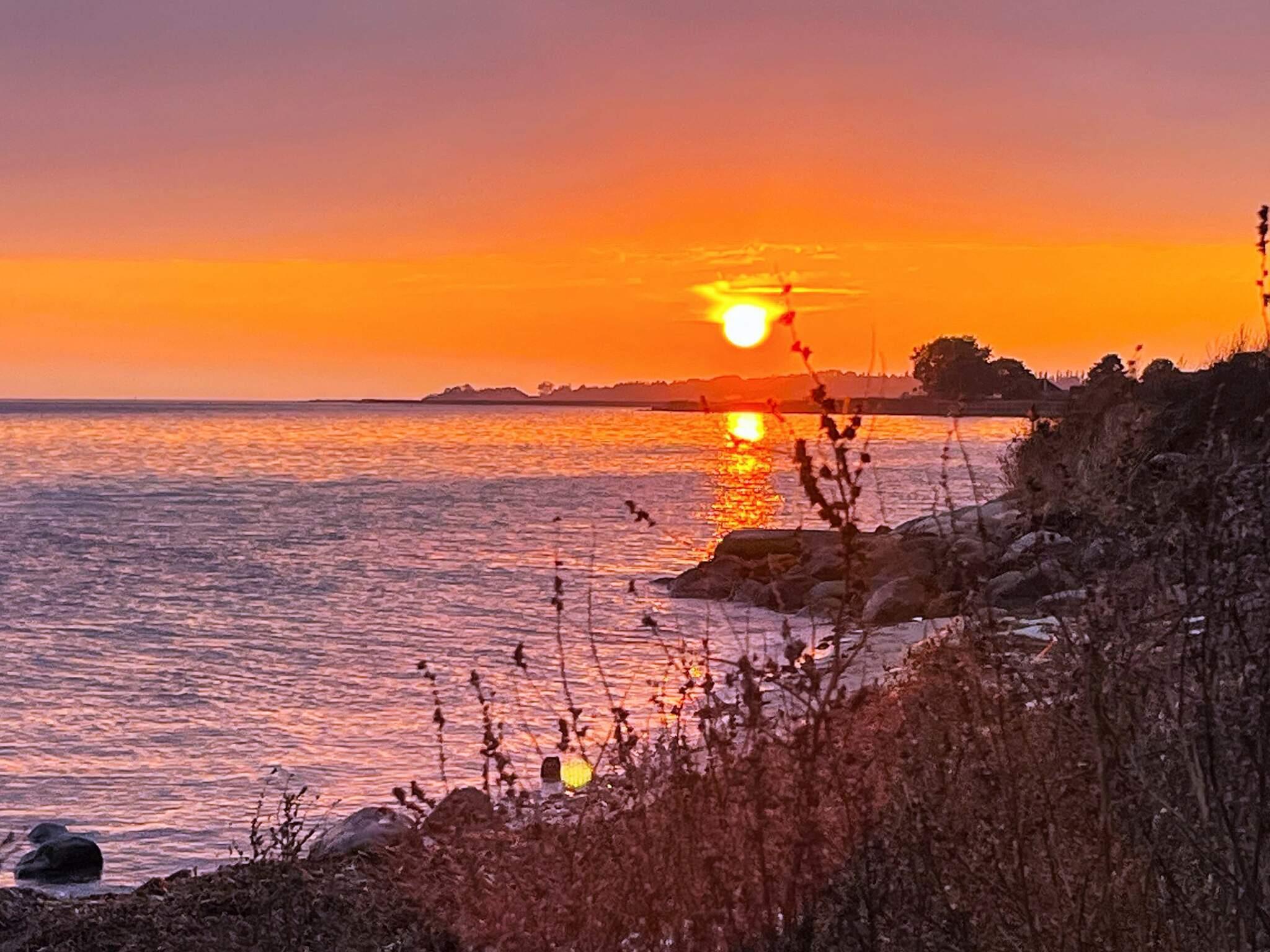 Auf der Terrasse genießen Sie den Blick über Felder und Wald und am Abend zum Sonnenuntergang. Im Außenbereich gibt es eine praktische Außendusche mit Warmwasser. Das Haus liegt in der Nähe eines schönen Strandes.