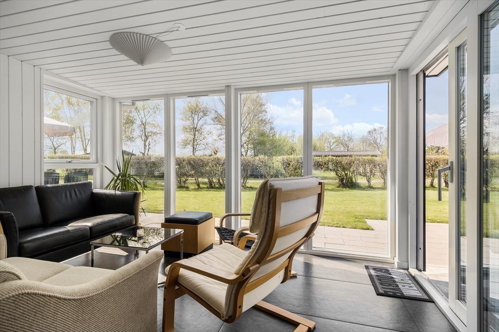 Willkommen in deinem Ferienhaus: Treten Sie in den Flur ein und gelangen Sie weiter in die helle Küche mit gutem Essbereich, von der Sie auch direkten Zugang zu einer der Terrassen haben. Weiter geht es in das geräumige Wohn- und Esszimmer, in dem Sie die gemütliche Atmosphäre mit schönem Blick auf den großen Garten genießen können. Außerdem gibt es einen schönen Wintergarten, der an das Wohnzimmer angrenzt und mehrere bequeme Sitzmöglichkeiten bietet. Das Haus verfügt über zwei Schlafzimmer, jeweils mit zwei Schlafplätzen, sowie ein praktisches Badezimmer mit Toilette, Dusche und Waschbecken.