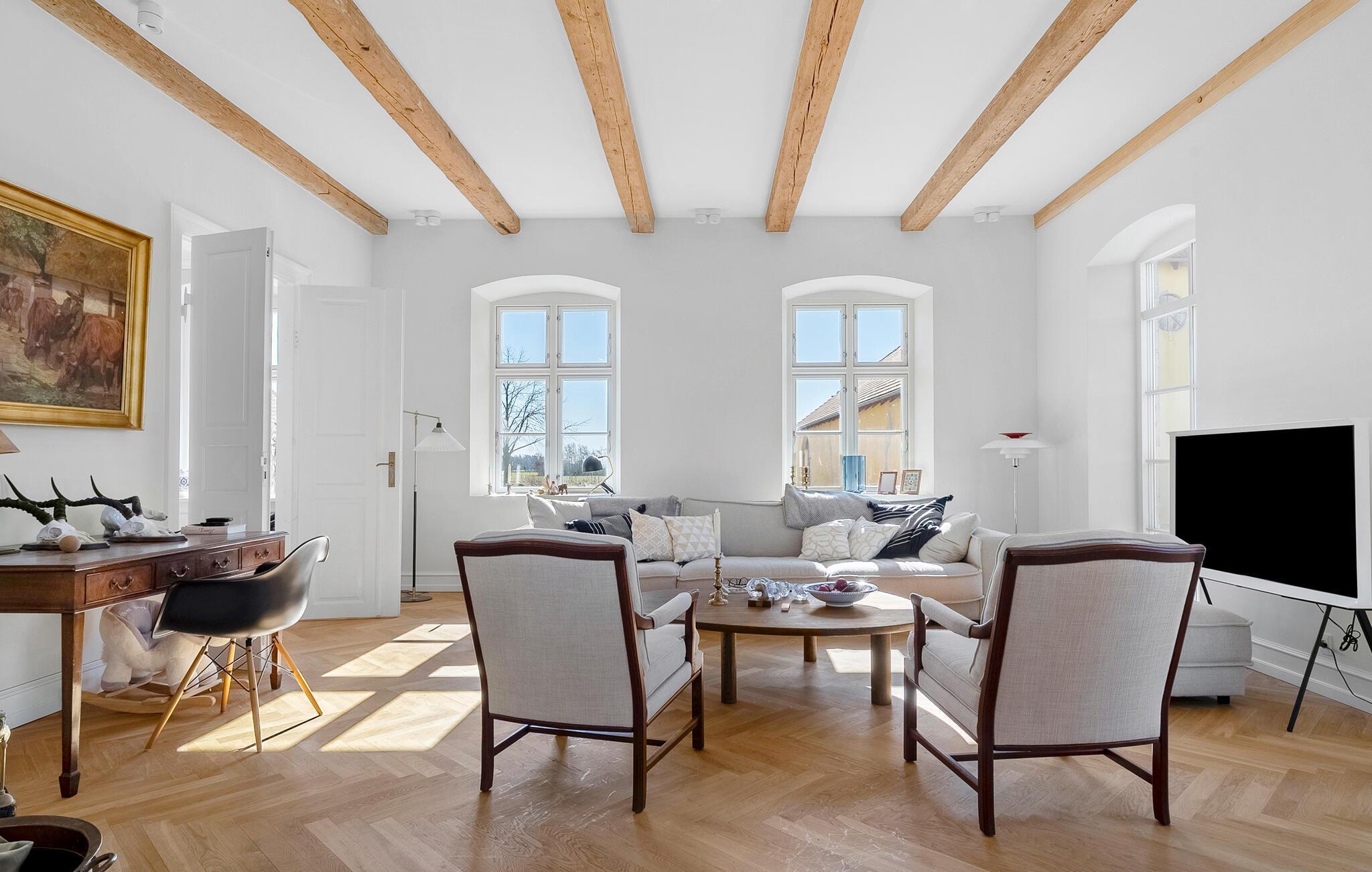 Genießen Sie eine gemütliche Auszeit in diesem charmanten, liebevoll restaurierten Ferienhaus. Die ländliche Ruhe und der weite Blick über die Felder bis hin zum Meer schaffen eine wundervolle Kulisse für entspannte Tage in der Natur. Freuen Sie sich in Ihrem Haus auf den einzigartigen Mix aus historischem Charme und modernem Komfort. Die hohen Decken mit freiliegenden Balken, die eleganten Holzfußböden und die großen Fenster sorgen für eine helle und einladende Atmosphäre. Machen Sie es sich auf den stilvollen Sofas gemütlich und genießen Sie den Blick ins Grüne. Die offene Küche ist modern ausgestattet, während der angrenzende Essbereich mit seinem großen Holztisch zu geselligen Mahlzeiten einlädt.