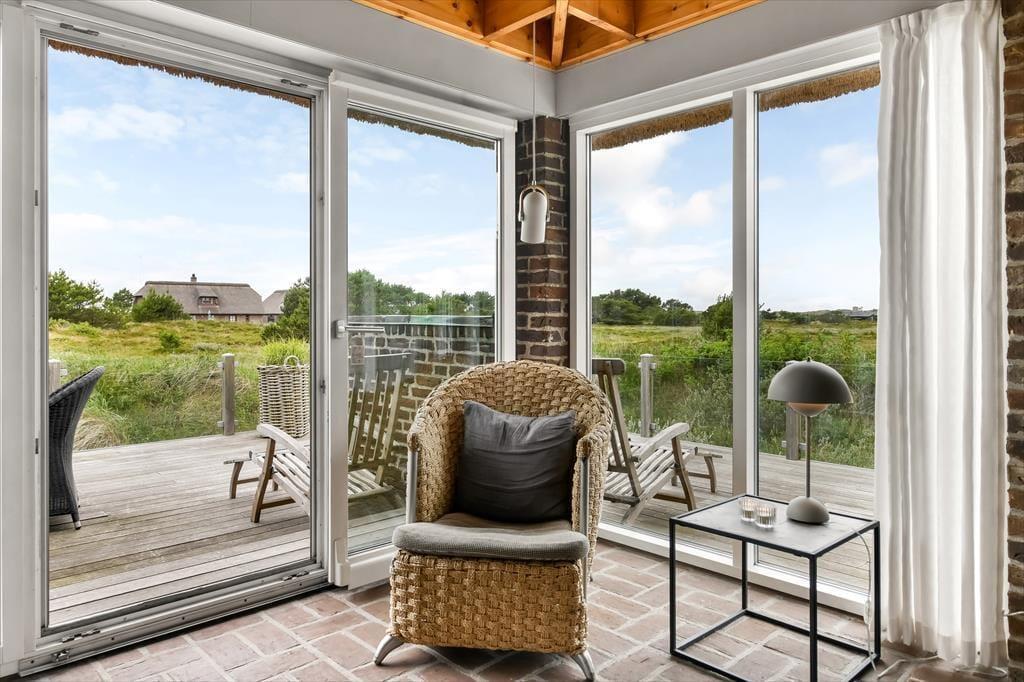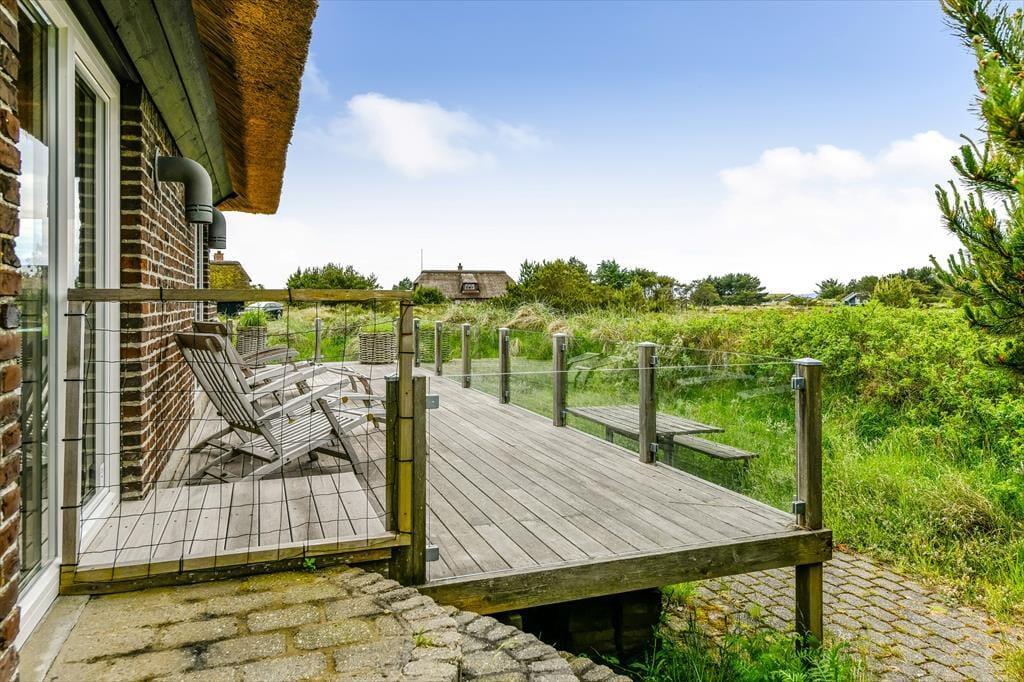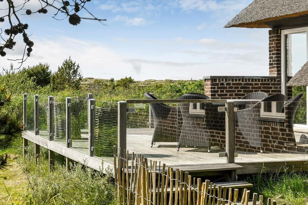 Im Zuge der Modernisierung wurde das Ferienhaus mit einer attraktiven Holzterrasse versehen, die einen schönen, ansprechend hellen Kontrast zur rotbraunen Steinfassade und dem gepflegten Reetdach bildet. Die Terrasse wird gen Westen durch eine flache Glasumrandung vom meist vorherrschenden Westwind abgeschirmt. Während du dich hier mit einem kühlen Getränk in der Sonne niederlässt, genießt du freien Ausblick über die offene Landschaft. Für die frühen Morgenstunden bietet sich die Ostterrasse an. Sie ist großzügig bemessen und liegt völlig ungestört, von den hohen Nadelbäumen gut vor Wind geschützt, auf dem Naturgrundstück.