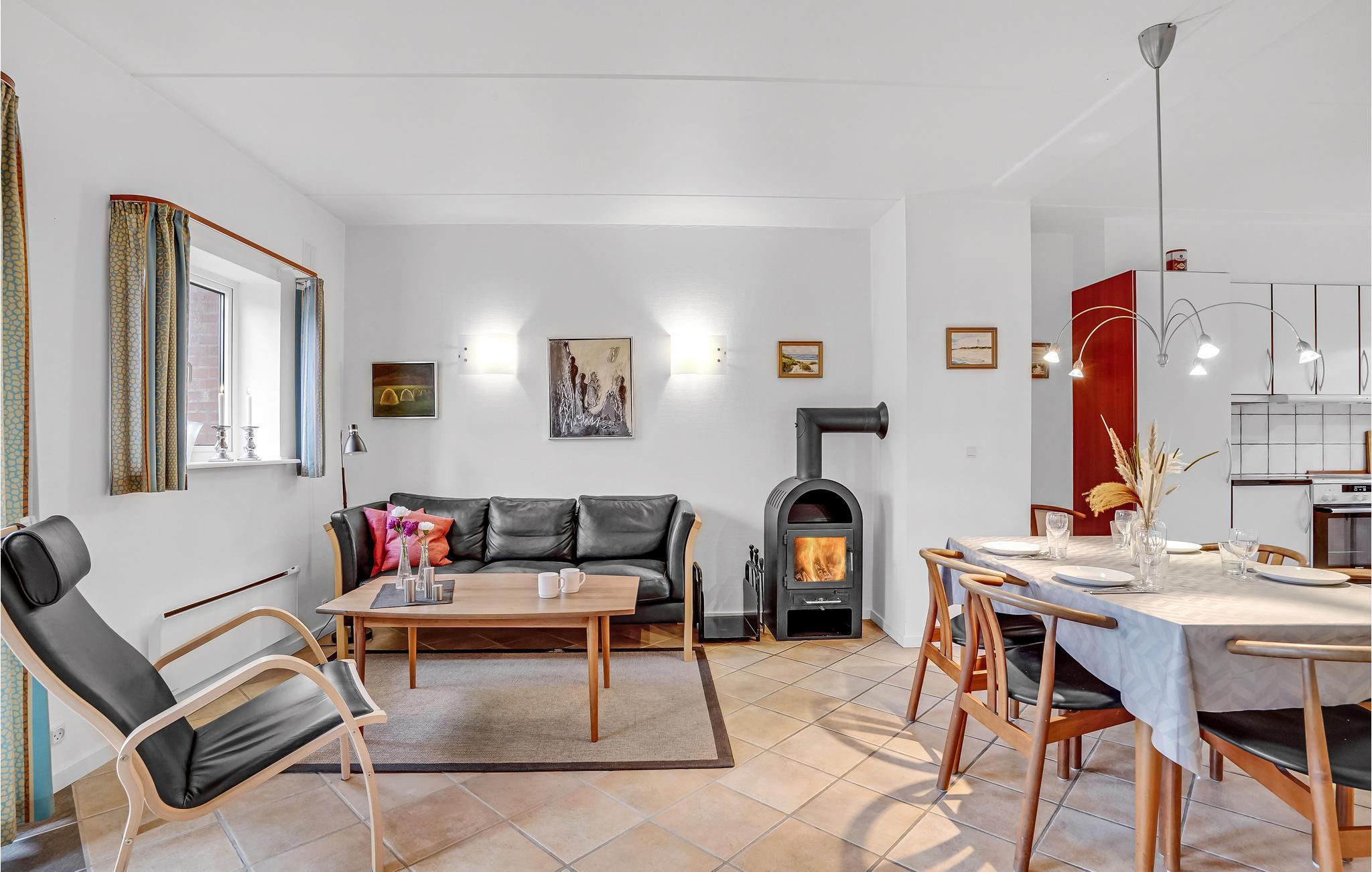 Gemütliches reetgedecktes Reihenhaus in Blåvand mit Terrasse und Kaminofen, nahe weißem Sandstrand.