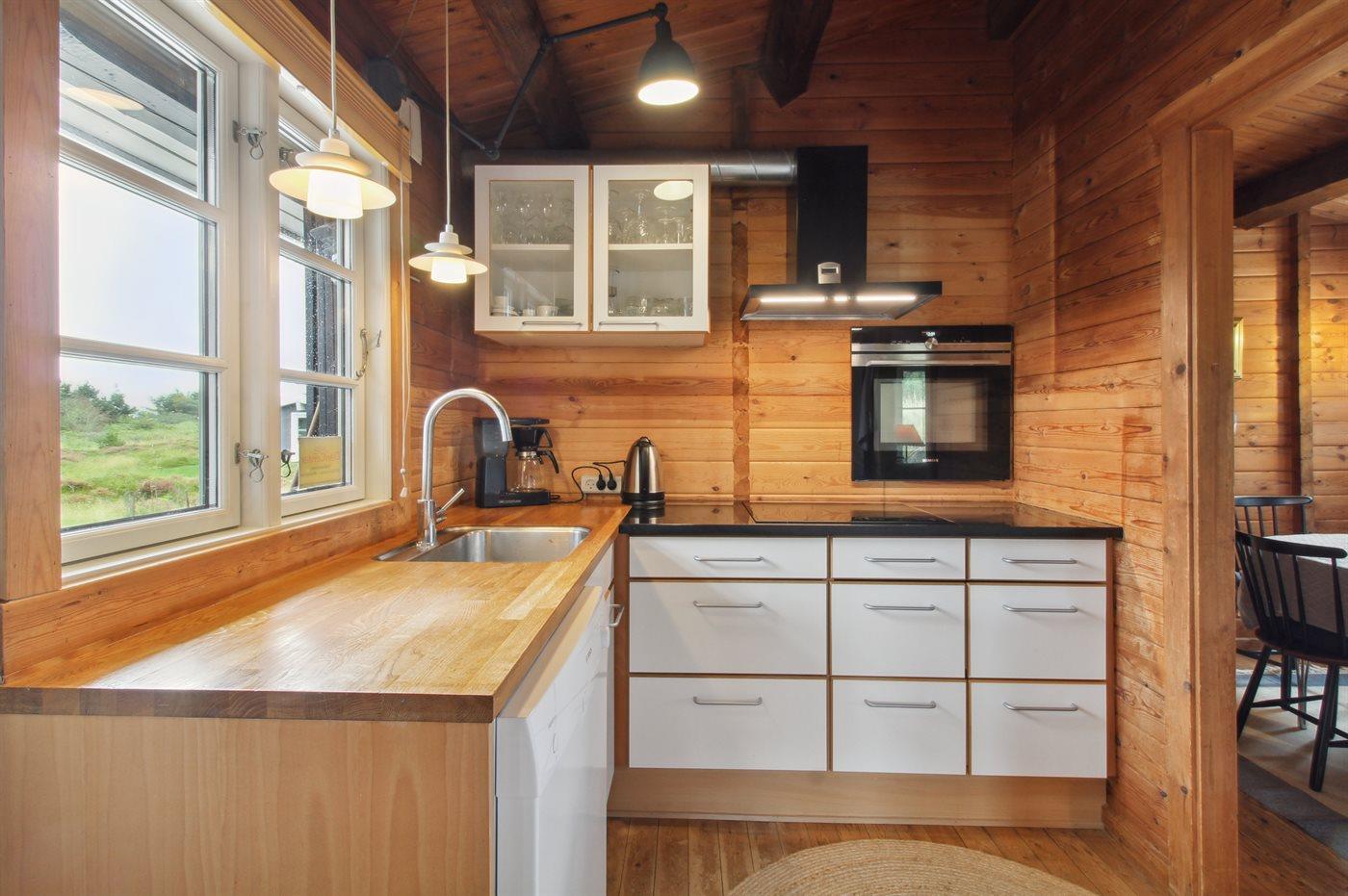 Das Ferienhaus ist rustikal und gemütlich eingerichtet mit Holzmöbeln und Tekstilien in warmen Farben, die für ein gemütliches Ambiente sorgen. Das Haus verfügt über ein Wohnzimmer mit Kaminofen, eine kleine, jedoch gut funktionierende Küche, drei Schlafzimmer und ein Badezimmer mit Duschnische. Außerdem bietet das Ferienhaus modernere Annehmlichkeiten wie Waschmaschine, Wäschetrockner, Geschirrspülmaschine sowie TV und Internetverbindung an.