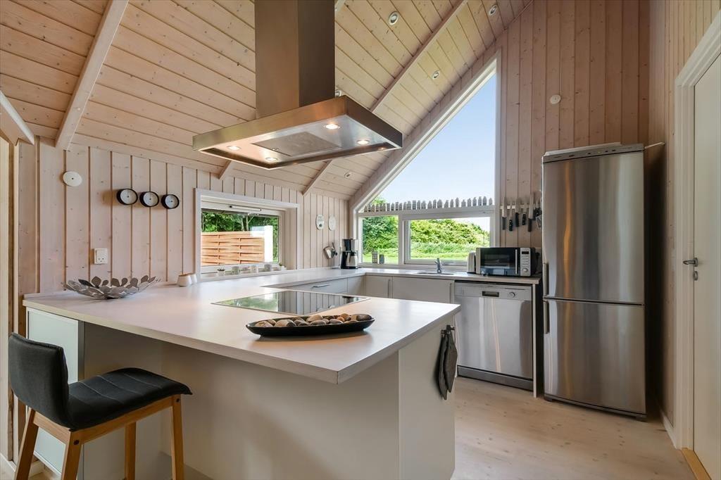 Mit drei guten Schlafräumen, einem Badezimmer, einem Gäste-WC und einem großen Wohnraum samt integrierter, offener Küche beherbergt dieses Ferienhaus bequem bis zu sechs übernachtende Urlauber. Daher können Sie im Vorwege überlegen, ob Sie vielleicht noch ein paar gute Freunde mit in den Urlaub einladen. Ganz gleich mit wie vielen Personen Sie anreisen, werden Sie sich mit Sicherheit an der einladenden Wohnatmosphäre mit komfortablen Möbeln erfreuen. Im gesamten Haus sorgen helle Holzverkleidungen an den Wänden und hohe Decken für klassischen Ferienhauscharme. Dank der komplett verglasten Giebelseite durchströmt den Wohnraum viel natürliches Licht. An kühlen Abenden sorgt der knisternde und behaglich wärmende Kaminofen für ein Maximum an Ferienhausgemütlichkeit. Unterhaltung verspricht der im Wohnraum platzierte Smart-TV, auf dem Sie Ihre Lieblingsserie schauen können. Wenn Sie sich nach einem erlebnisreichen Urlaubstag erholen möchten, nehmen Sie einfach ein Bad im Whirlpool oder den ein oder anderen erquickenden Saunagang.