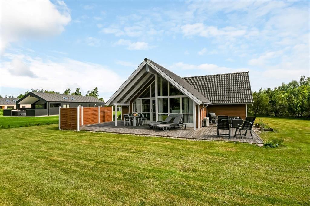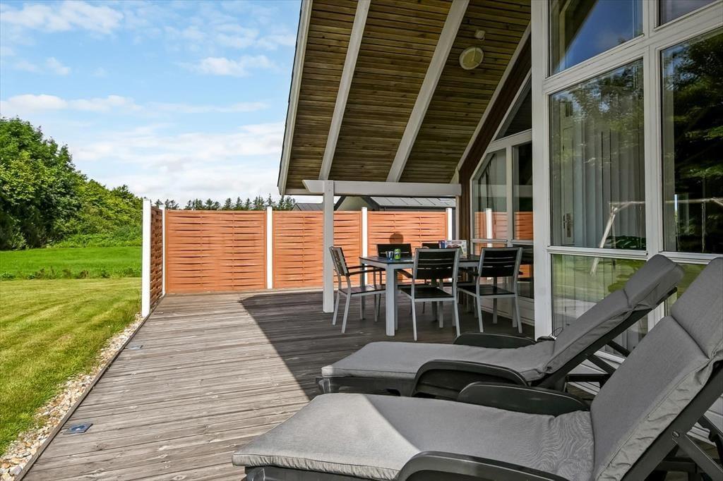 An sonnigen Tagen wird es Sie und Ihre Lieben sicherlich hinaus auf die große und teilweise überdachte Holzterrasse ziehen, die sich an drei Seiten des Ferienhauses schmiegt. Das Grundstück umfasst eine Fläche von 1.200 m² und bietet Ihnen und Ihren Kindern auf der Grasfläche ausreichend Platz zum Umhertollen und für Ballspiele. Für die jüngsten Urlauber steht ein Schaukelgerüst bereit.