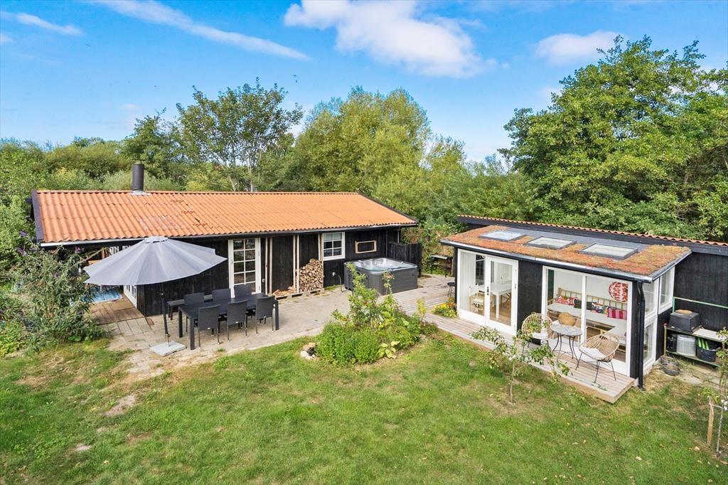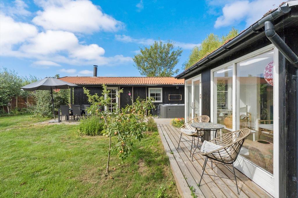 Das Ferienhaus liegt auf einem ruhigen Grundstück mit Rasenfläche und schönen Terrassen, die sowohl mit dem Haupthaus als auch dem Annex verbunden sind. Hier findest du unter anderem einen großen Außen-Whirlpool mit Platz für fünf Personen, der sich innerhalb weniger Stunden aufheizt – einfach am Relais einschalten. Zudem gibt es eine Außendusche zur Abkühlung an warmen Sommertagen. Es gibt reichlich Platz zum Entspannen und Verweilen, und du findest mit Sicherheit ein sonniges oder schattiges Plätzchen – ganz nach Wunsch. Die Terrasse ist mit Gartenmöbeln, einer kleinen Außenküche und einem Grill ausgestattet, sodass du auch gemütliche Abendessen unter freiem Himmel genießen kannst, wenn der Tag sich dem Ende zuneigt. Der Garten ist eingezäunt, sodass Kinder und Hund frei auf dem Grundstück herumlaufen können.