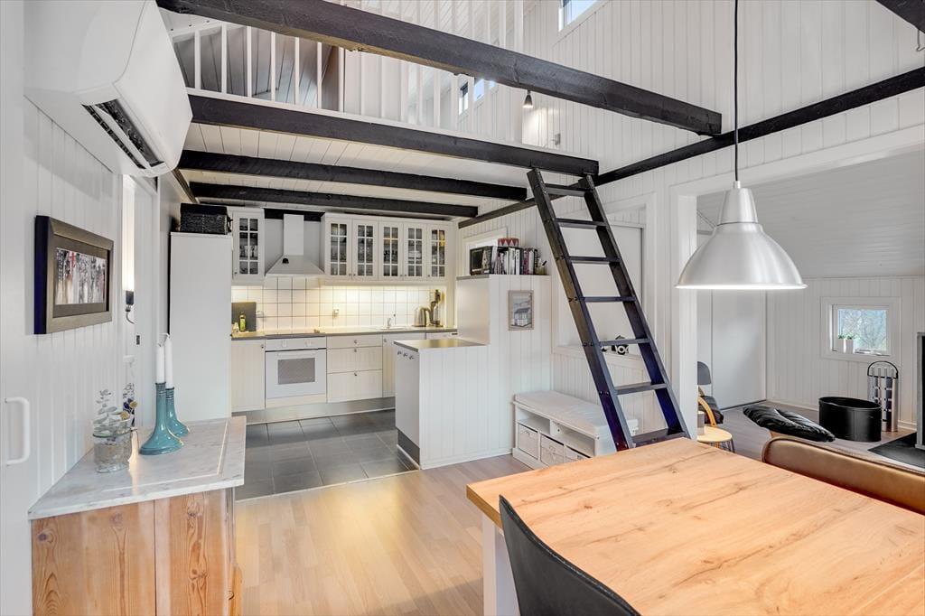Jeder einzelne gut genutzte Quadratmeter des Hauses besticht mit einer hellen einladenden Atmosphäre. Vom Hauswirtschaftsbereich gelangen Sie in die ansprechende, funktionelle Küche, die unter anderem mit einem Geschirrspüler und anderen guten Küchengroßgeräten ausgestattet ist. Küche, Essbereich und Wohnraum bilden eine offene Einheit. Dadurch ist es für Sie ein Leichtes, die Mahlzeiten am gut platzierten Esstisch zu servieren. Das gemütliche Feuer im Kaminofen beobachten Sie während gemeinsamer Mahlzeiten und während Sie es sich in aller Ruhe in der Polstersitzgruppe gemütlich machen. Ein Duschbadezimmer und zwei Schlafräume mit je einem Doppelbett stehen für die bereit. Über eine Leiter erreichen Sie den offenen Schlafboden, der nachts als Schlafplatz und tagsüber als gemütlicher Rückzugsort fungiert.