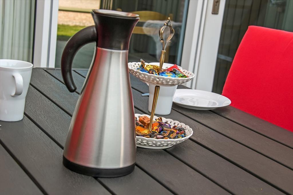 Die Terrasse ist komplett umzäunt und ausreichend von den Nachbarn abgeschirmt und mit Sonnenschirm, Grill, Gartenmöbeln und Liegestühlen haben Sie alles, was Sie brauchen, um das Leben unter freiem Himmel zu genießen. In der Nähe des Ferienhauses gibt es Parkplätze und auch einen Spielplatz, auf dem sich die Jüngsten austoben können. Für die etwas Älteren gibt es noch viel mehr zu tun, da die Wohnung zu Danland gehört und Sie daher die Sportplätze des Ferienzentrums frei nutzen können, wo Sie unter anderem Beachvolleyball, Petanque und Tennis spielen können.