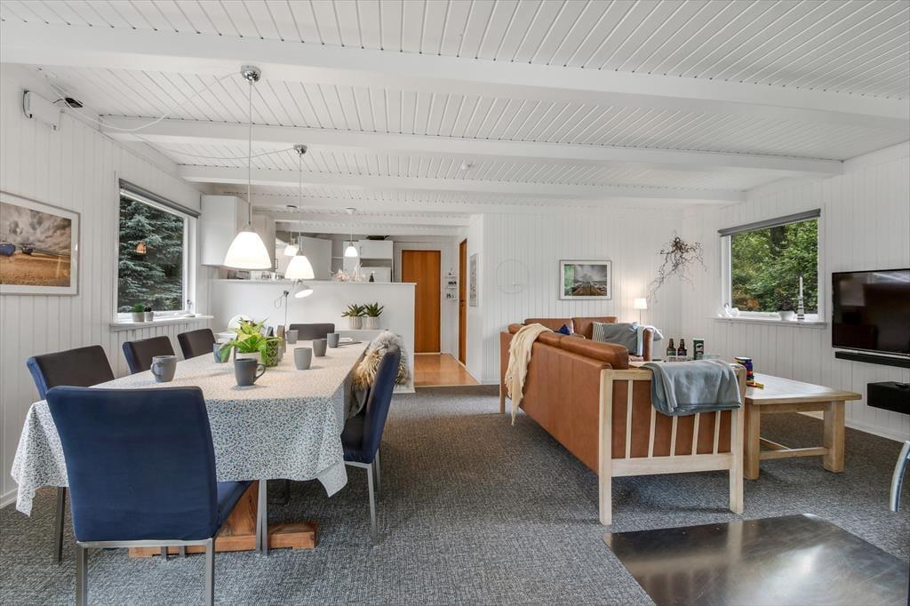 Aufgrund der weiß gestrichenen Holzwände, des Kaminofens und des komfortablen Mobiliars erwartet dich im Wohnraum schönste, klassische Ferienhausatmosphäre. Diese genießt du unter anderem, wenn du es dir mit einem spannenden Buch oder deinem Strickzeug auf dem Sofa gemütlich machst und wenn du mit deiner Familie unterhaltsame Gesellschaftsspiele spielst. Für Abwechslung und Unterhaltung sorgt ein großer, an der Wand hängender Flachbild-TV, der zu geselligen Filmabenden einlädt. Falls du lieber hinaus ins Grüne statt auf den Fernseher schaust, solltest du die hellen Sommerabende im angrenzenden Wintergarten verbringen. Die großen und kleinen Mahlzeiten des Tages bereitest du mit deinen Lieben in der offenen Küche zu, die direkt an den Wohnraum schließt. Drei ansprechende Schlafräume und ein Badezimmer stehen ebenfalls für euch bereit.
