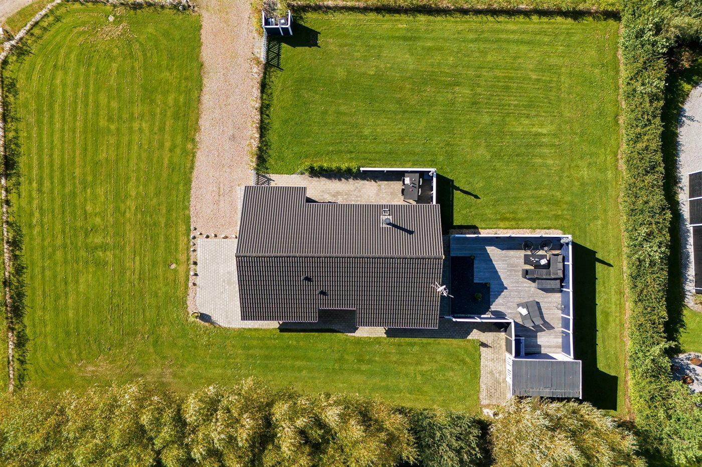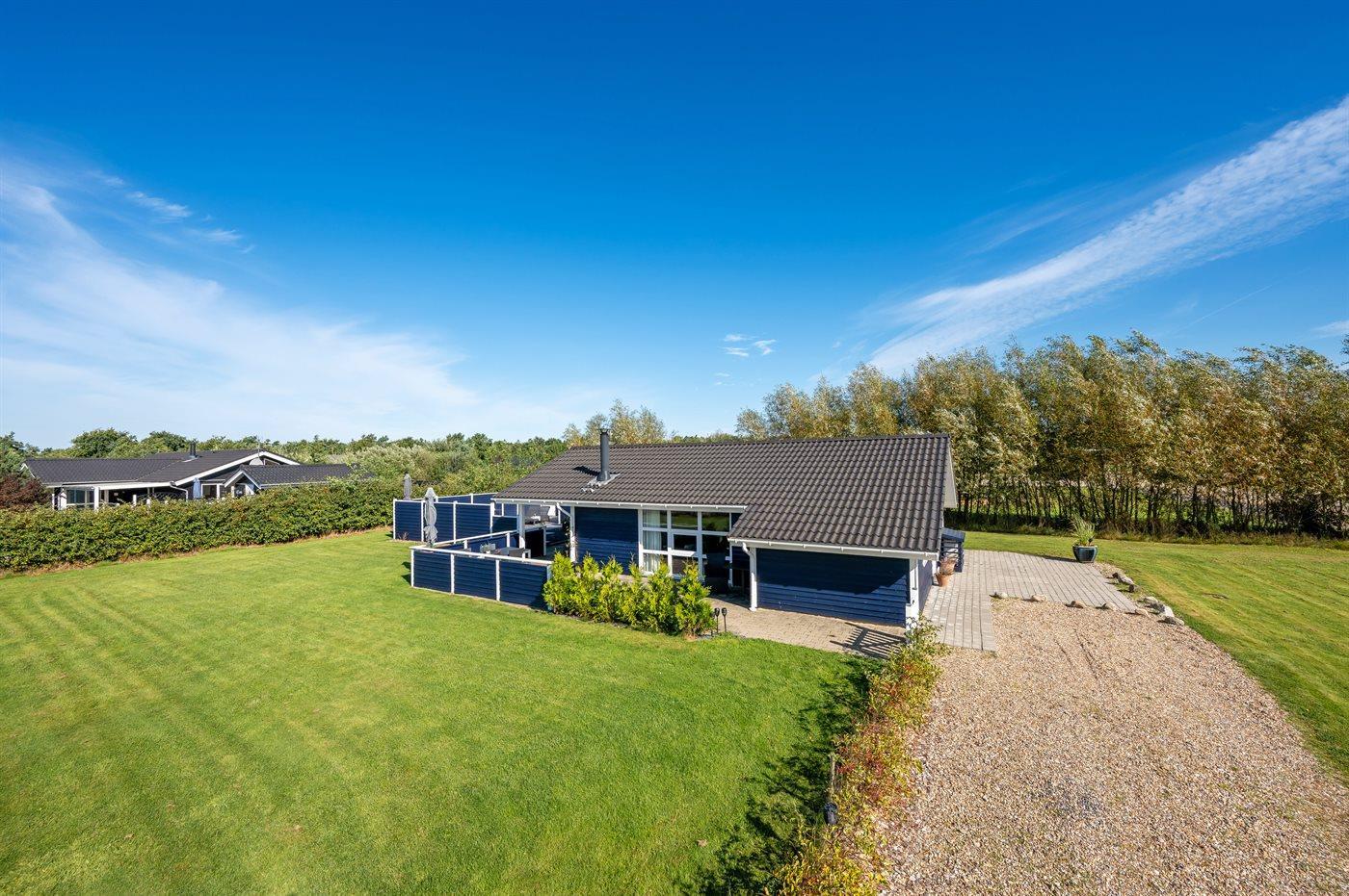 Die Ferienunterkunft liegt auf einem 1200 m² großen Naturgrundstück. Das Grundstück ist mit einem 50 cm hohen Zaun eingezäunt. Die Entfernung zum Meer beträgt 6760 m. Die Entfernung zum Fjord beträgt 1370 m.Die Entfernung zum Wattenmeer beträgt 6700 m. Die nächste Einkaufsmöglichkeit liegt 3000 m entfernt. Es steht ein 40 m² Terrassenareal zur Verfügung. Außerdem gibt es 10 m² überdachte Terrasse. Die Entfernung zu einem Spielplatz beträgt 100 m. Parkplatz auf dem Grundstück.