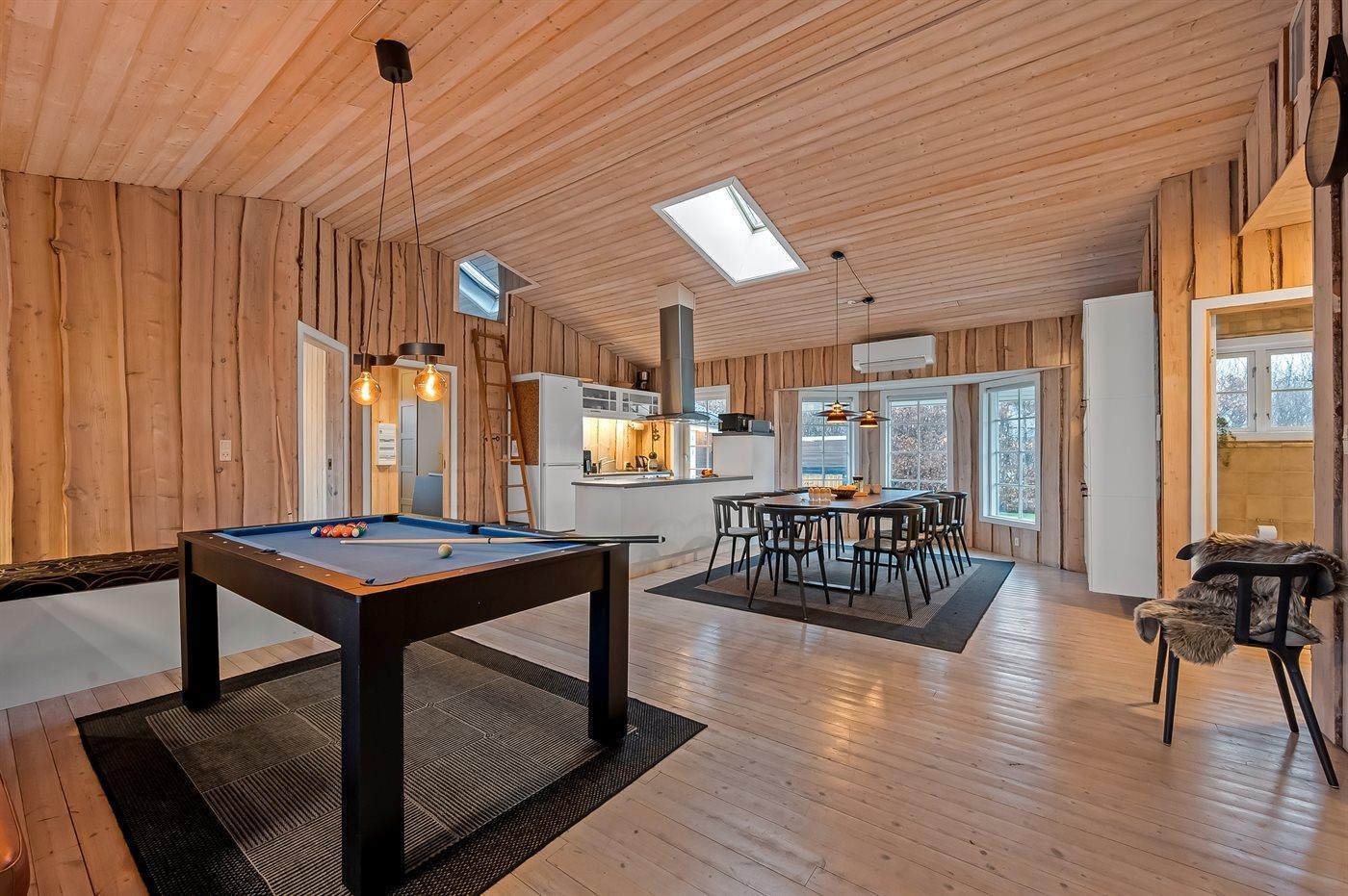 Der helle Küchen-Wohnbereich mit den großen Fensterfronten lädt zu gemütlichen Stunden und geselligem Beisammensein ein. Hier kann man sich am Kamin für eine Runde Brettspiele versammeln oder sich am Pooltisch spannende Duelle liefern. Vom Küchen-Wohnbereich aus hast du direkten Zugang zur schönen Terrasse, auf der du herrliche Stunden an der frischen Luft mit einem guten Buch oder einem Kreuzworträtsel genießen kannst.