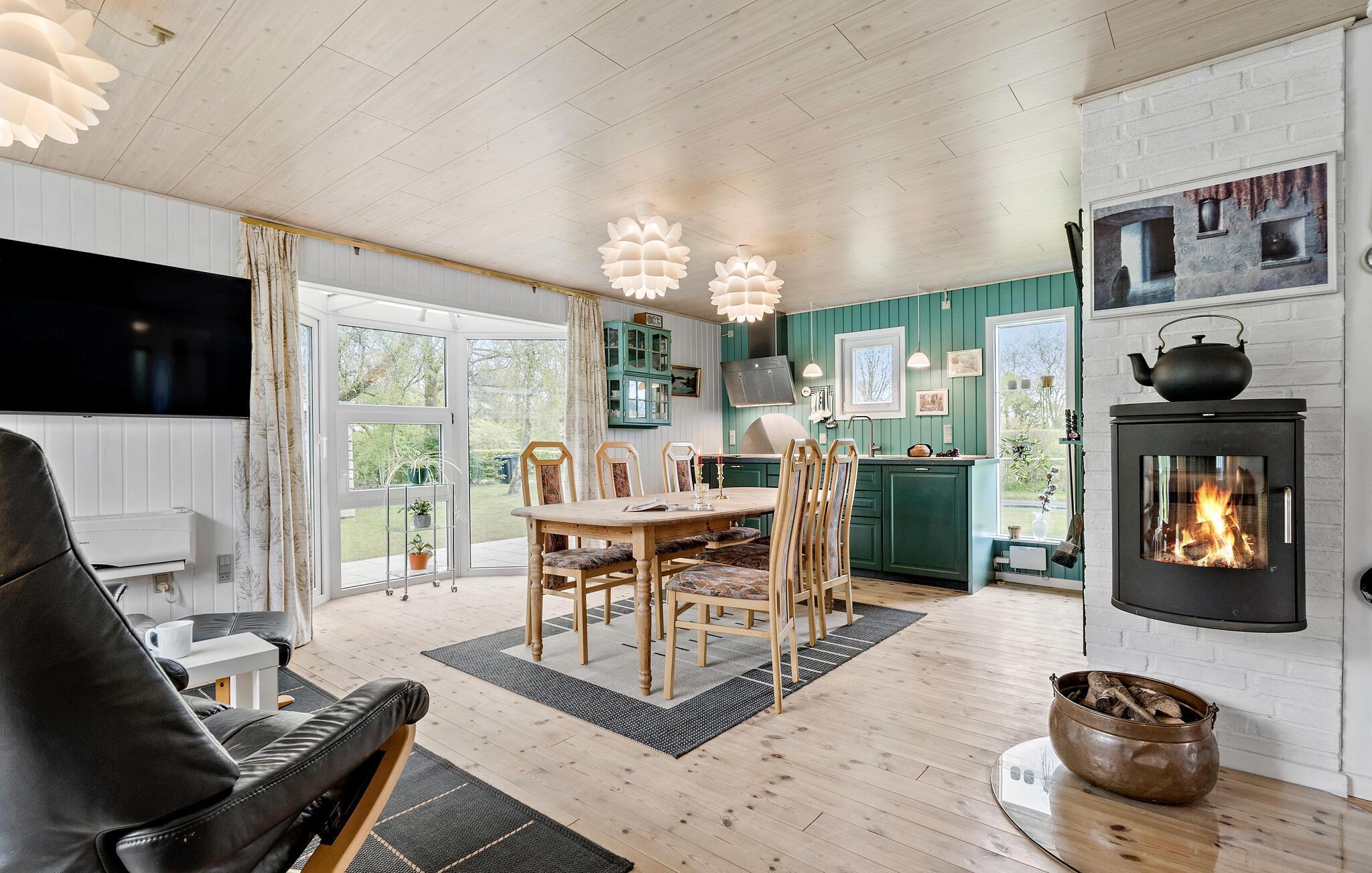 Hier begrüßt Sie eine echte Landhausatmosphäre in herrlicher Lage, welches ausreichend Platz für 6 Personen mit einem Haustier bietet. Dieses typische Holzhaus bietet Ihnen einen wunderbaren und rustikal dekorierten Wohnraum, mit gemütlichen Möbeln und wärmenden Kamin. Hier können Sie es sich bei wohliger Wärme und mit einem Gläschen Wein im Wohnraum gemütlich machen. Dank der vielen Fenster gelangt unglaublich viel Licht in den Raum, welches das natürliche Flair noch etwas verstärkt. Im Freien gibt es auch einen privaten Garten und Kugelgrill, sowie viele Spiele, mit denen man sich unterhalten kann.