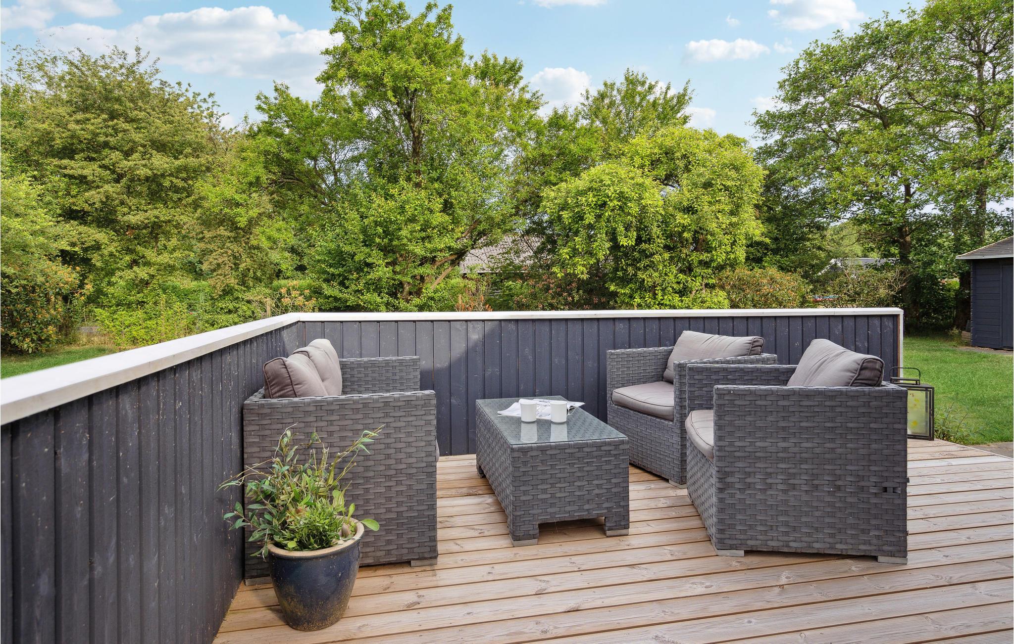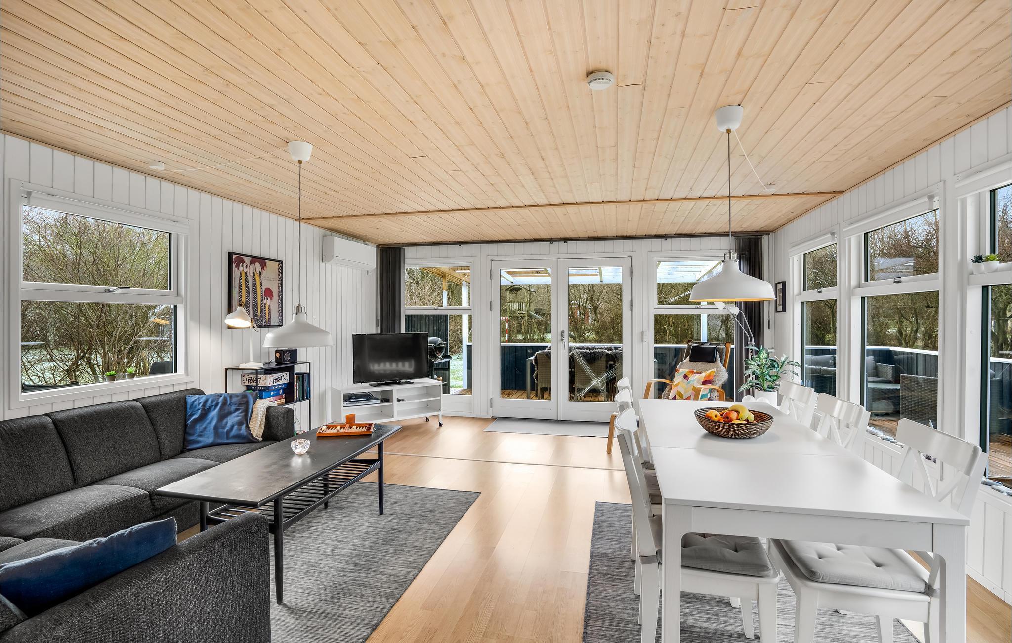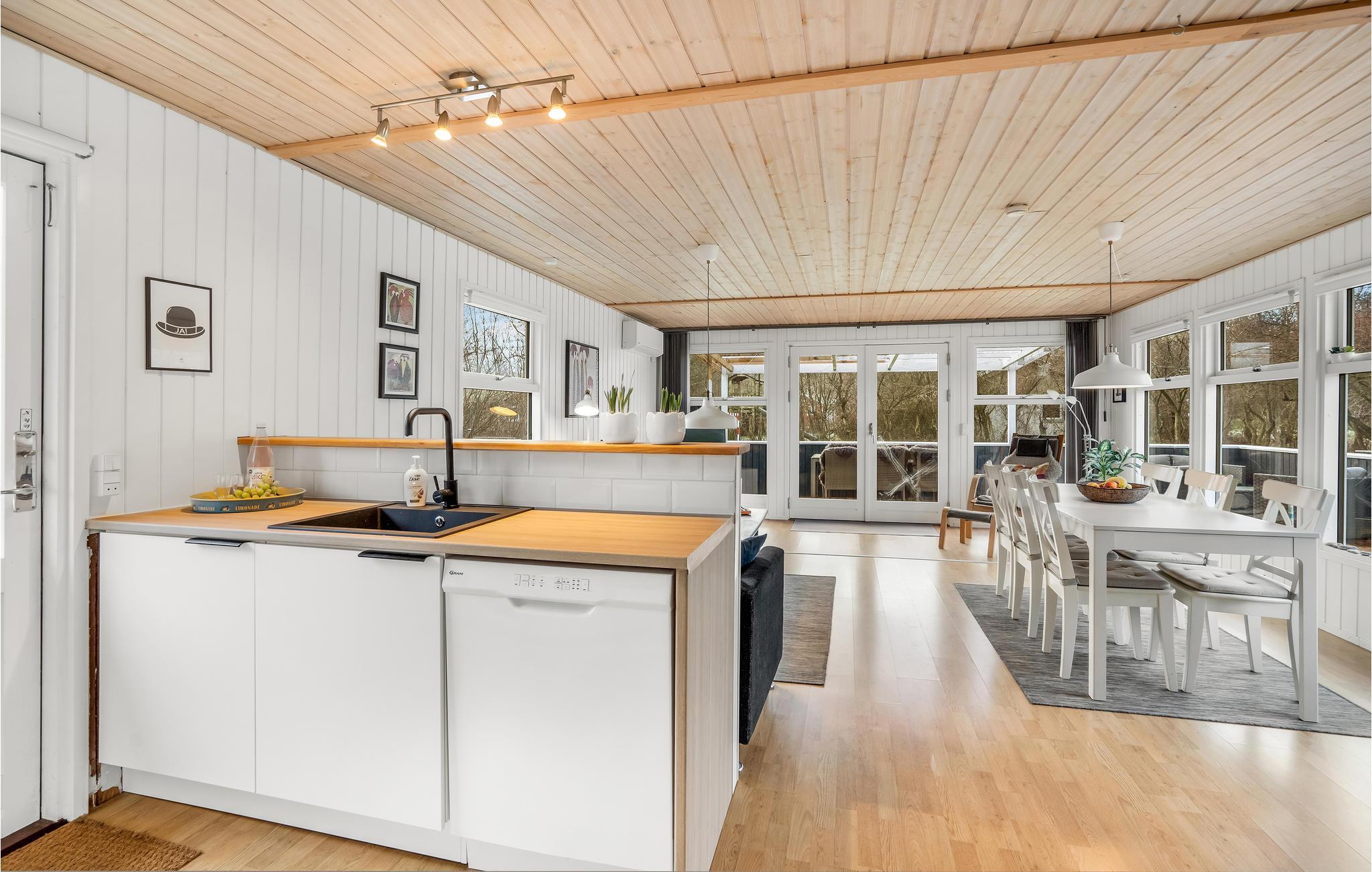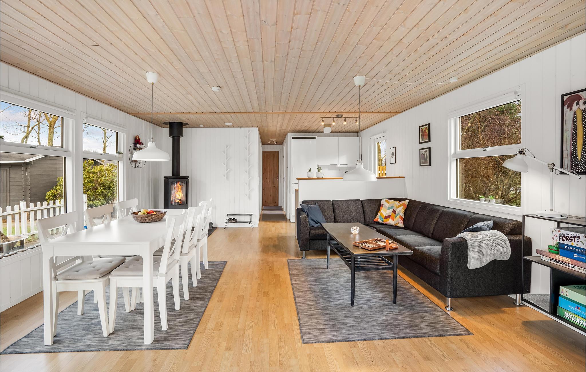 Genießen Sie entspannte Ferien und schöne Wohnen in diesem charmanten Ferienhaus. Aufgrund der großen Fenster können Sie viel natürliches Licht im Wohnraum genießen, der Küche, Ess- und Wohnzimmer vereint. Das hat den Vorteil, dass Sie an den Gesprächen der anderen jederzeit teilnehmen können, egal ob Sie kochen oder es sich mit einem Spiel auf dem Sofa gemütliche gemacht haben. An kühlen Tagen trägt der Kaminofen zum Wohlfühlerlebnis bei die teilweise überdachte Terrasse ist das Highlight an Sommertagen. Starten Sie dort mit einem leckeren Frühstück und beobachten Ihre Kinder beim Fußballspielen und Toben im Garten.