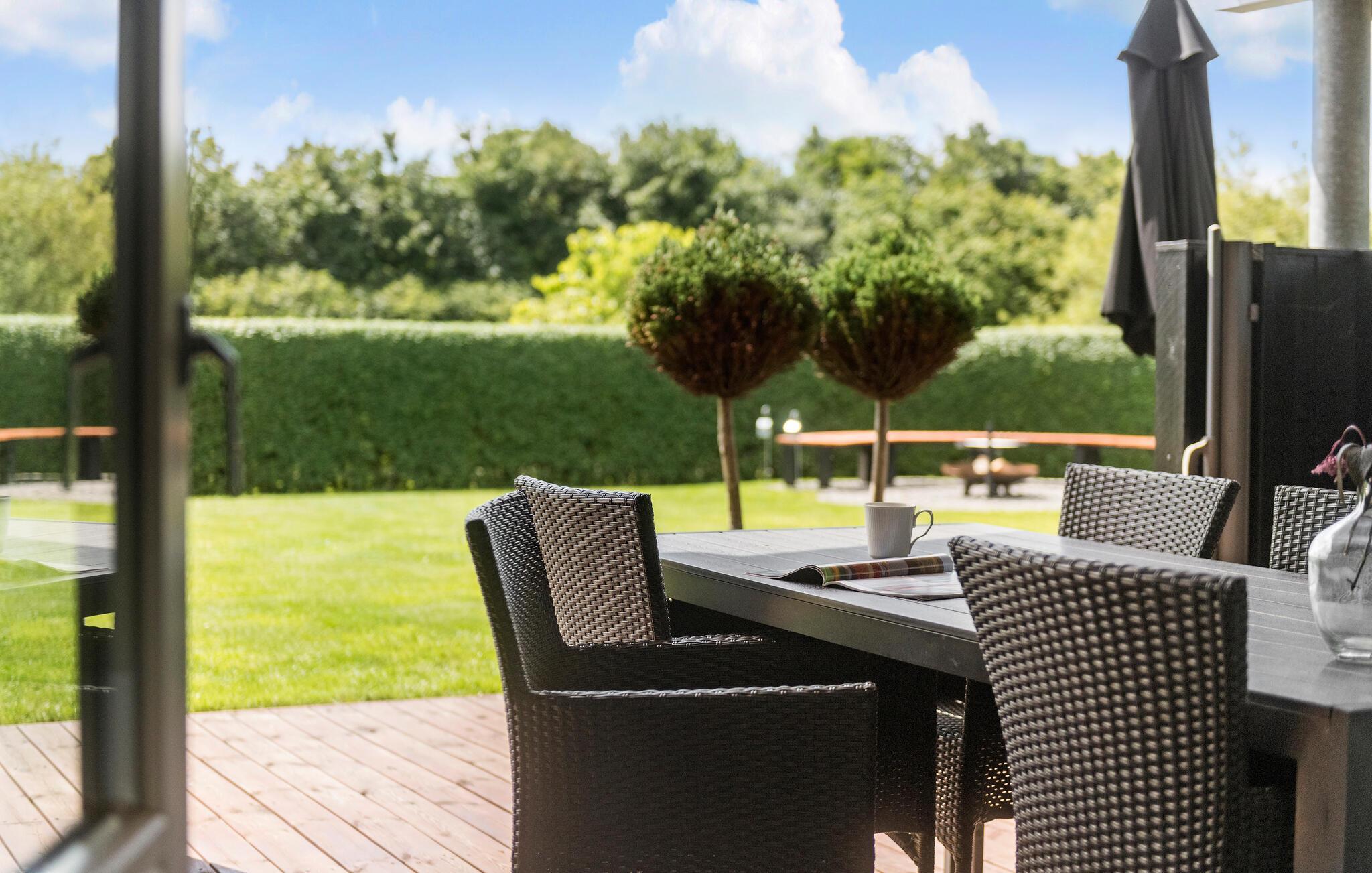 Verlegen Sie die Mahlzeiten an warmen Tagen ins Freie und genießen Sie die Sonne auf der Terrasse, bevor Sie mit den Kindern den großen Spielplatz nahe dem Haus besuchen.