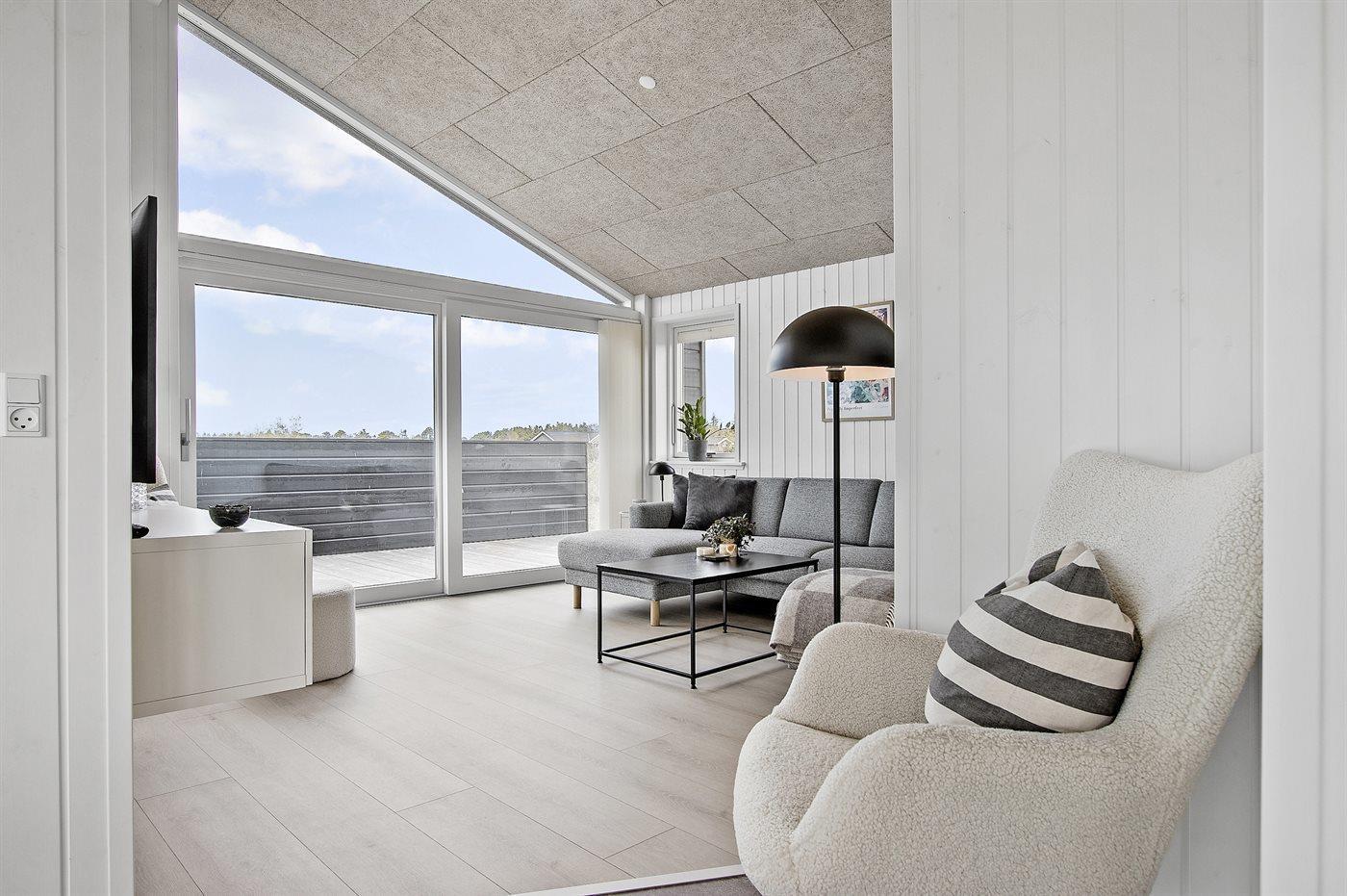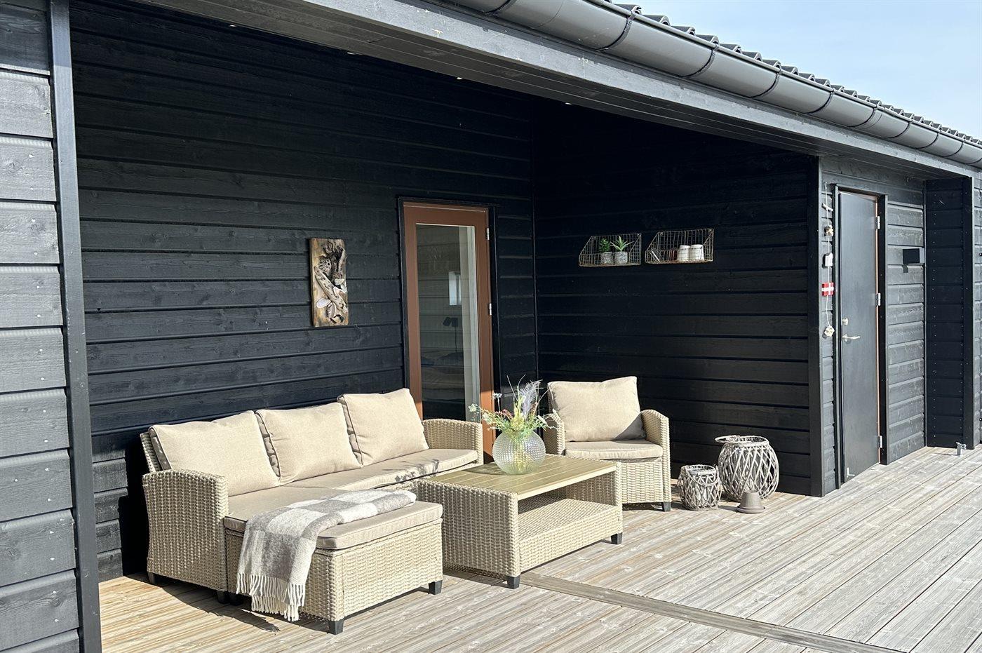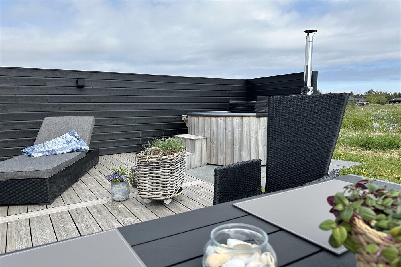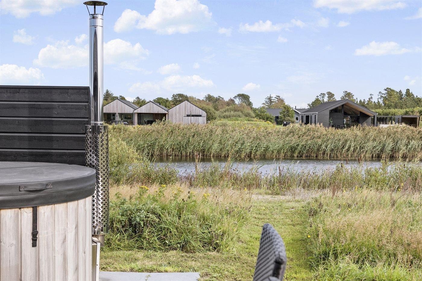 Modernes Ferienhaus mit Hot Tub, Terrasse und Seeblick nahe kinderfreundlichem Strand in Bratten, Dänemark.