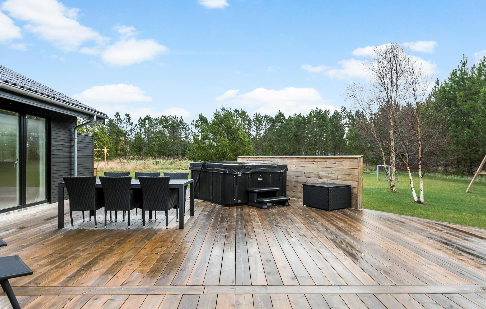 Genießen Sie auch den Garten sowie die weitläufige Holzterrasse, die den Garten umgibt. Spüren Sie die Sonnenstrahlen auf der Haut, während Sie im Whirlpool relaxen oder am Abend Ihre Lieblingsspeisen auf dem Grill zubereiten.