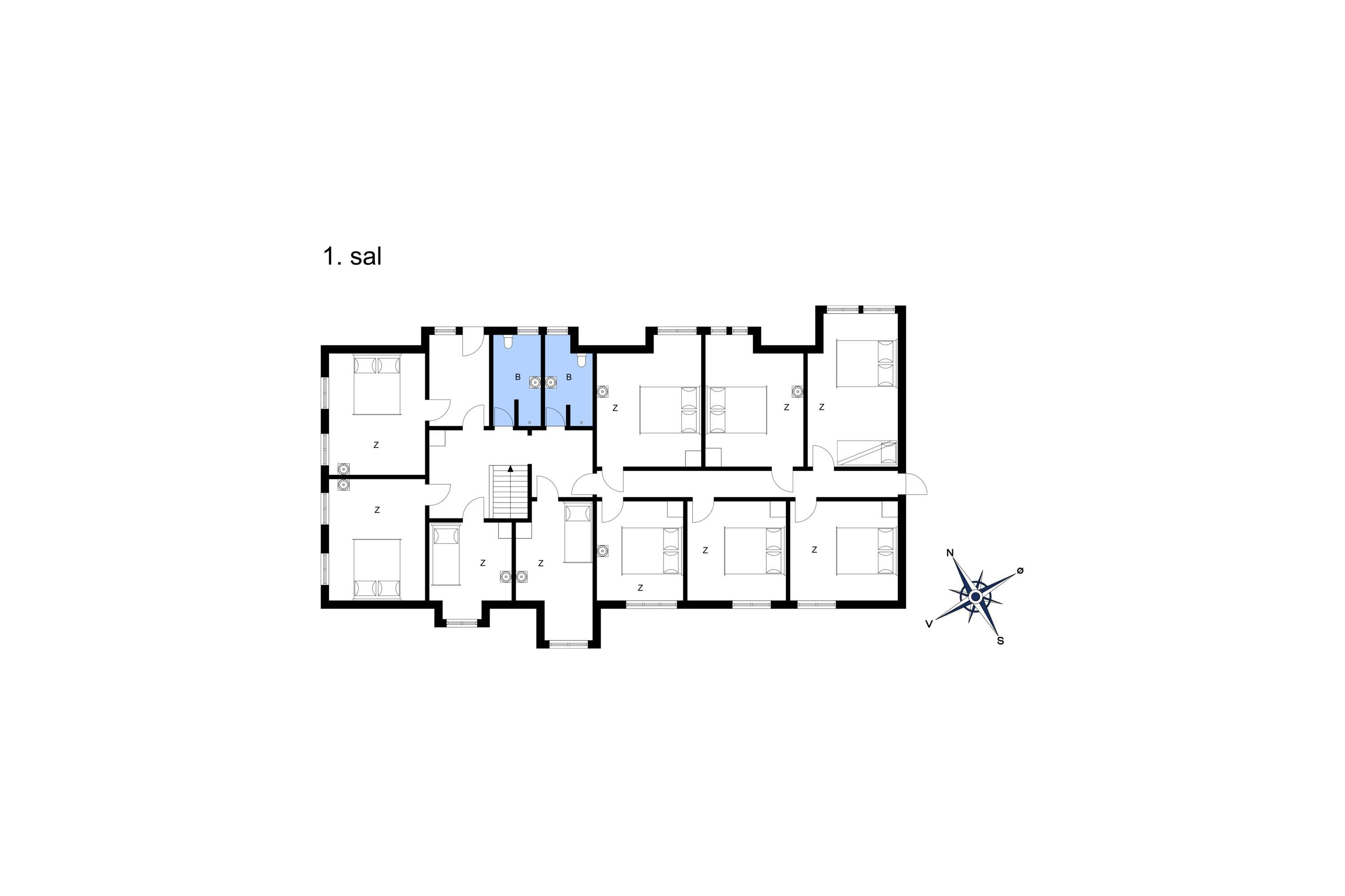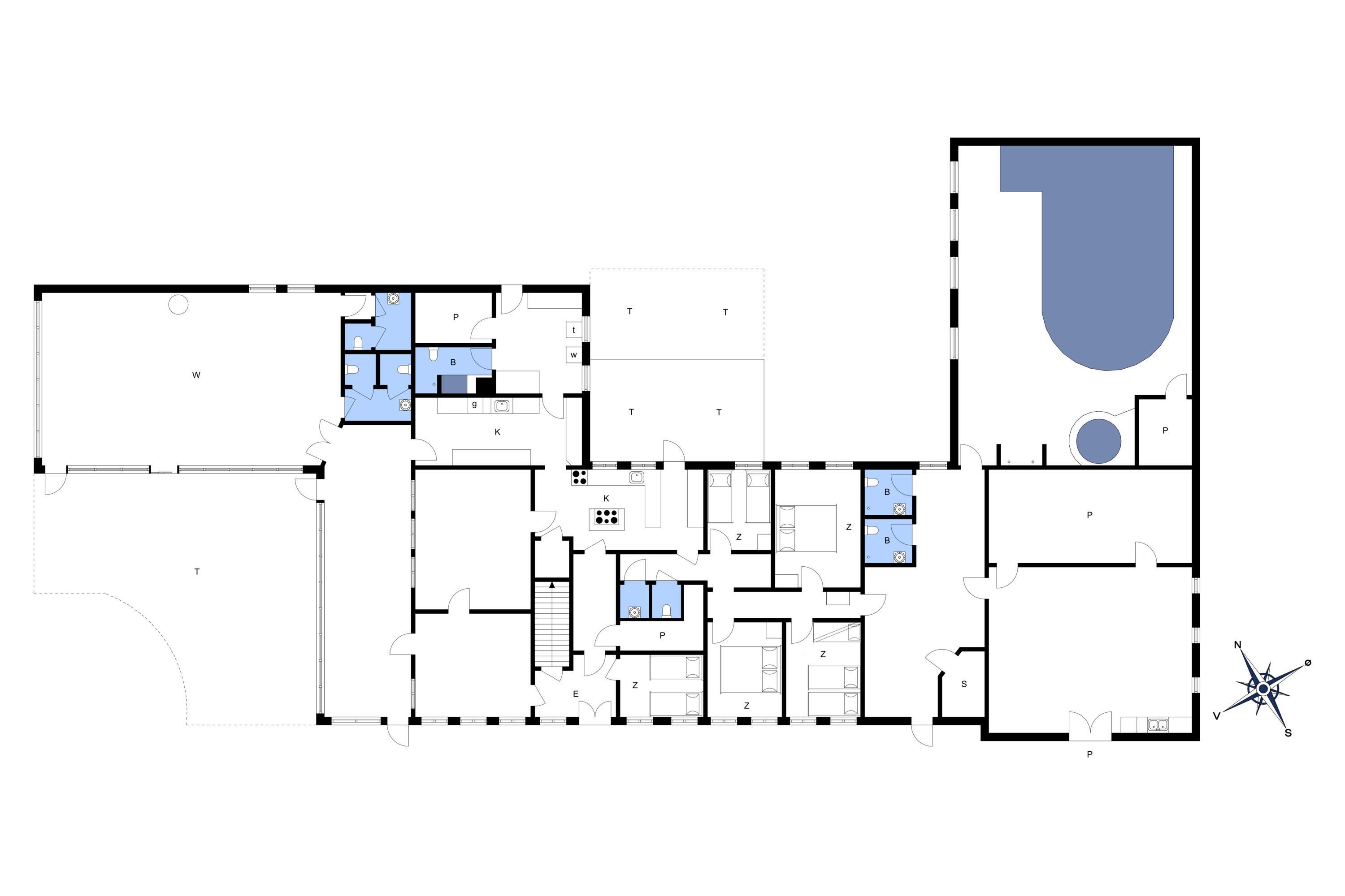 Das zweistöckige Haus verfügt im Erdgeschoss über einen einladenden Poolbereich mit einem 40 m2 großen Swimmingpool mit Gegenstromanlage, großem Whirlpool, Dusche und Sauna. Darüber hinaus gibt es ein gemütliches und großes Wohnzimmer mit Sofaecken, TV, Brennofen und großen Panoramafenstern zum Wasser hinaus. Von hier aus kann man das separate Esszimmer betreten, das bis zu 32 Personen Platz bietet und ebenfalls eine Fensterfront zur Förde hinaus hat, sodass man die einzigartige Aussicht beim Essen genießen kann. Die funktionelle Industrieküche bietet viel Platz zum Kochen, und im Aktivitätsraum kann man Billard, Airhockey, Dart und Tischfußball spielen. Es gibt einen Kühlraum von ca. 5 m2 in Haus. Im Erdgeschoss befinden sich außerdem 5 Schlafräume, 2 davon sind mit Doppelbetten ausgestattet. 3 Badezimmer und 3 Gäste-WCs.