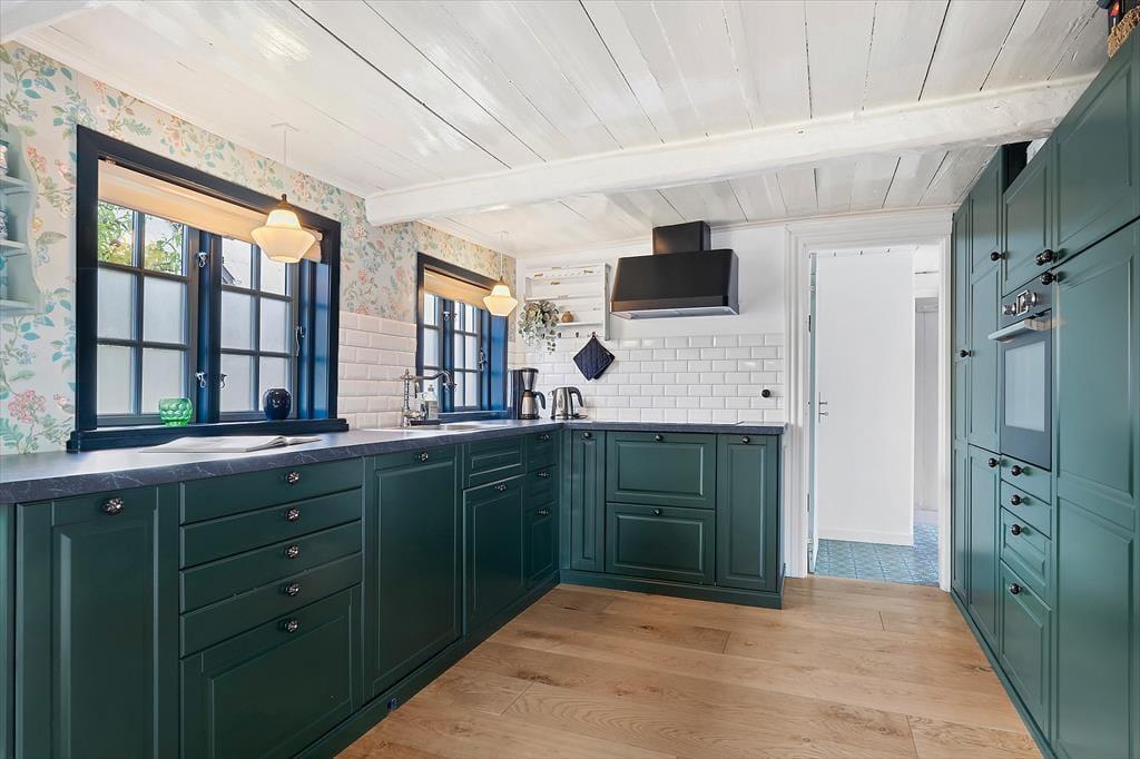 Die große, offene Küche ist direkt mit dem gemütlichen Essbereich verbunden, sodass Kochen und Zusammensein harmonisch ineinander übergehen. Hier können Sie lange Abendessen, gesellige Spieleabende und anregende Gespräche genießen – alles im wunderbaren Licht, das durch die Fenster und die Terrassentür einfällt. Vom Essbereich gelangen Sie auf eine herrliche, nach Westen ausgerichtete Terrasse – perfekt für sonnige Nachmittage und laue Sommerabende.