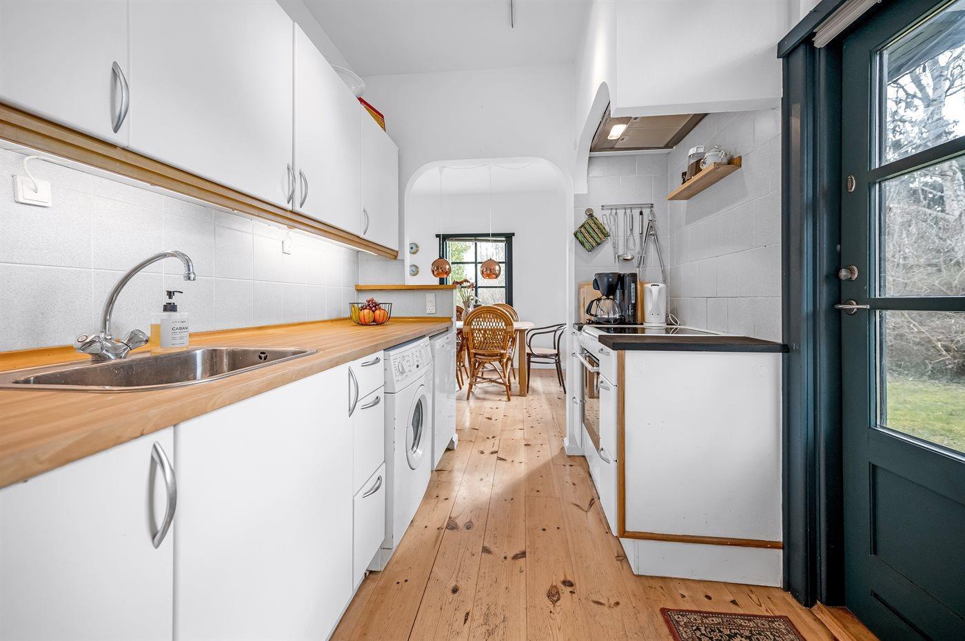 Das Haus ist hell und luftig mit viel Tageslicht und einer herrlichen sommerlichen Einrichtung. Das Wohnzimmer und der Essbereich sind offen gestaltet, und die Küche grenzt direkt daran an. Von hier aus gelangt man auf die Terrasse und in den Garten, wo mehrere gemütliche Ecken zum Verweilen einladen und man sowohl die Sonne genießen als auch Schatten finden kann. Es gibt außerdem eine Außensauna.