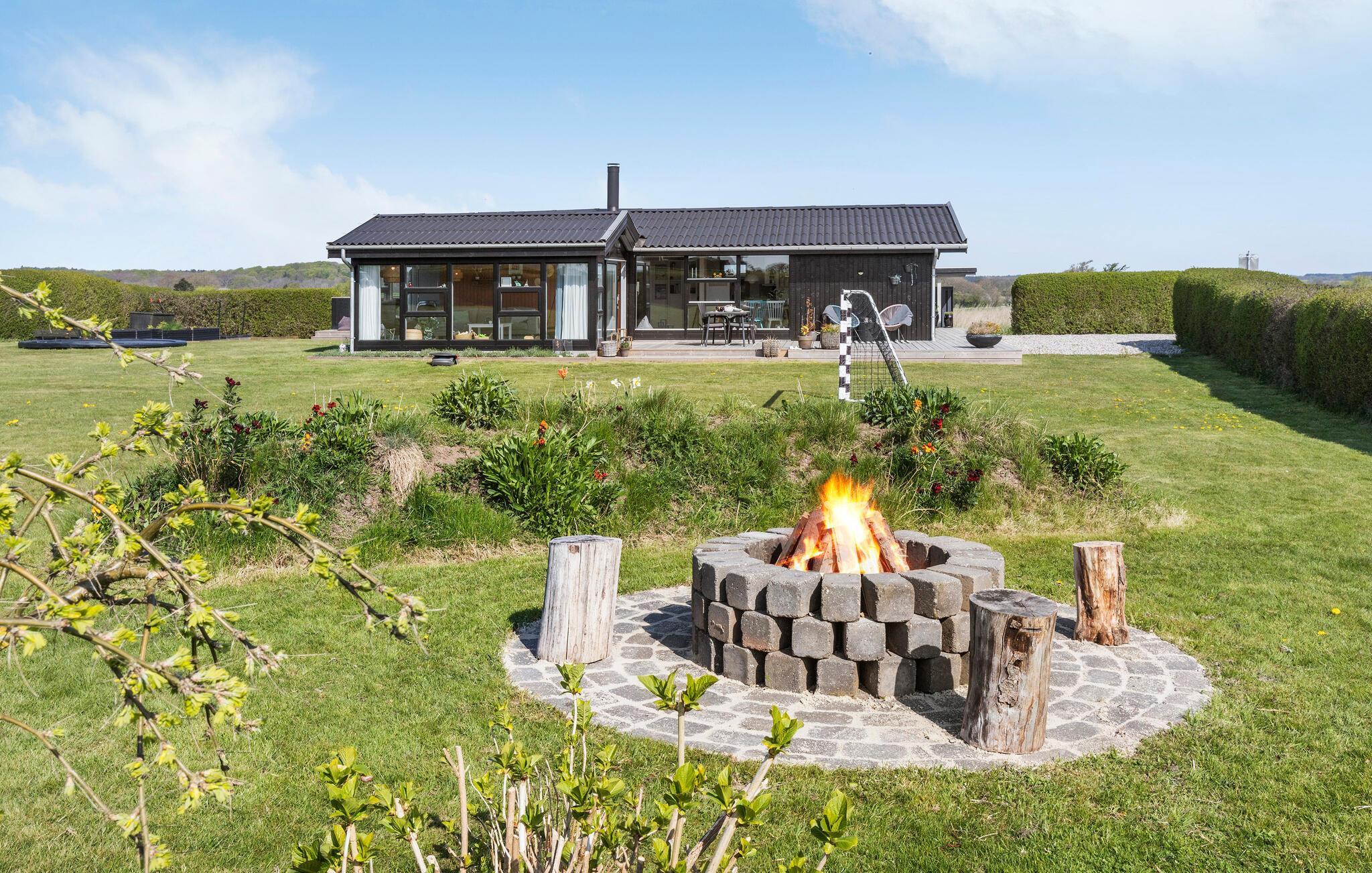 Gemütliches Ferienhaus mit Meerblick, Kamin und großem Garten nahe Dråby Strand, ideal für Familien und Erholung am Meer.