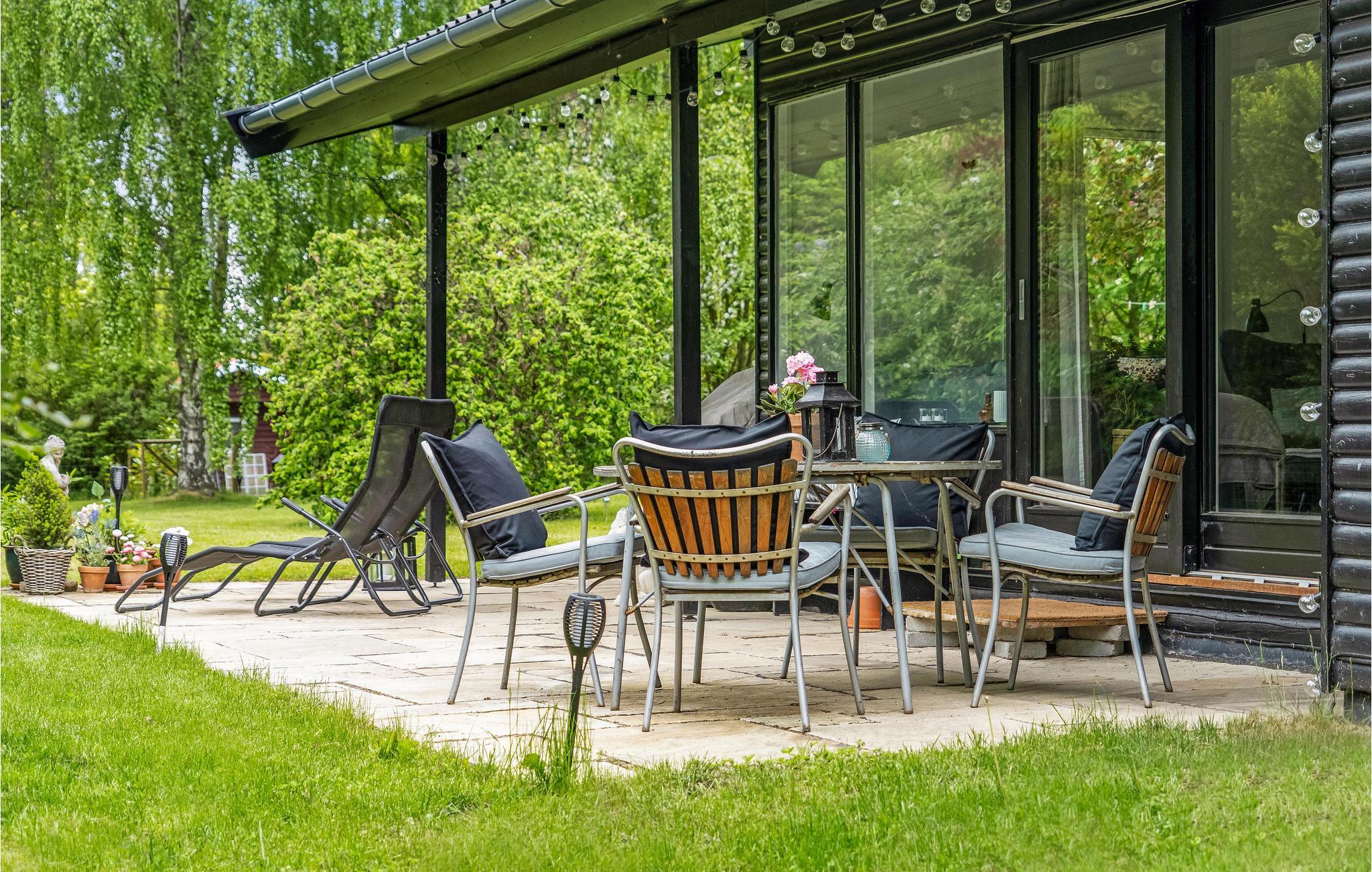 Willkommen in diesem einladenden Ferienhaus, das seine Gäste in einer schönen Lage erwartet. Mit 2 Schlafzimmern mit Doppelbett, bzw. Etagenbett, wo das untere 120 cm breit ist, bietet es Platz für 4 Personen und 1 Haustier darf auch mit in den Urlaub kommen. Machen Sie es sich nach einem schönen Urlaubstag gemeinsam am Kamin mit Glas an zwei Seiten bequem. Vom Wohnzimmer gelangen Sie auf die nach Süden gewandte Terrasse. Verbringen Sie angenehme Stunden im Freien auf den beiden Terrassen, wenn es abends kühler wird, können Sie hier auch heizen. Die überdachte Terrasse gen Westen bietet die Möglichkeit, die Sonne hinter den Birken untergehen zu sehen. Genießen Sie leckere Spezialitäten vom großen Gasgrill.