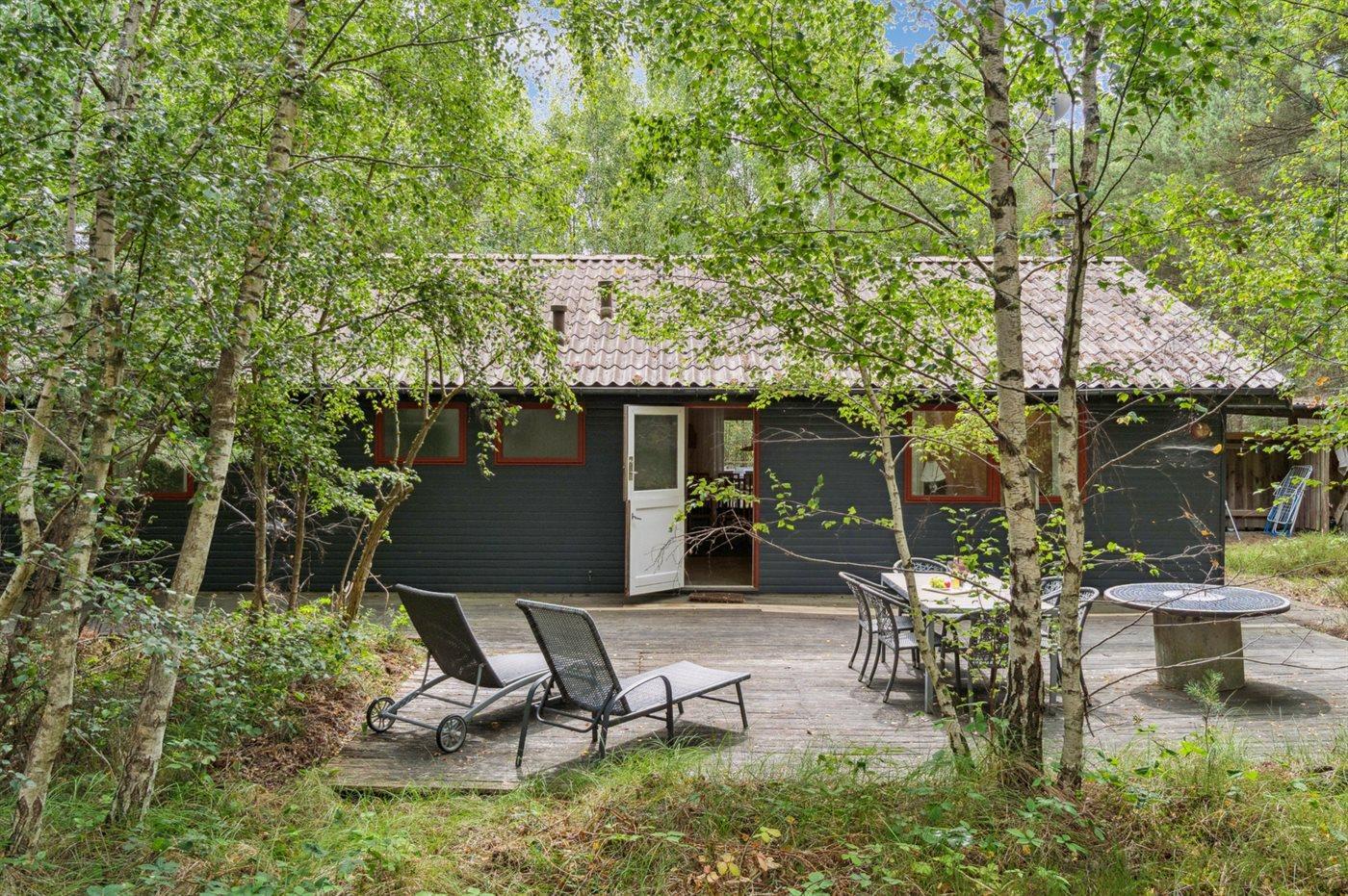Dieses blau gestrichene Ferienhaus, das von großen Holzterrassen umgeben ist, liegt nur 300 Meter vom lebhaften Zentrum Dueoddes entfernt. Das Haus liegt ungestört auf einem sehr großen und schönen Naturgrundstück mit Kiefern und Birken - zusammen mit zwei Nachbarhäusern.
