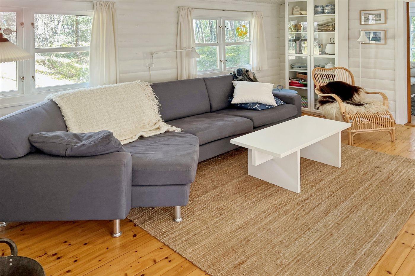 Das Dach ist mit Gras bewachsen, und das Haus liegt auf einem Naturgrundstück. Innen erwartet dich eine helle Einrichtung mit weiß gestrichenen Holzwänden und -decken. Die hellen Holzdielenböden vermitteln ein zeitloses und solides Gefühl – ganz typisch für ein Blockhaus dieser Art, in dem die Nähe zur Natur im Mittelpunkt steht.