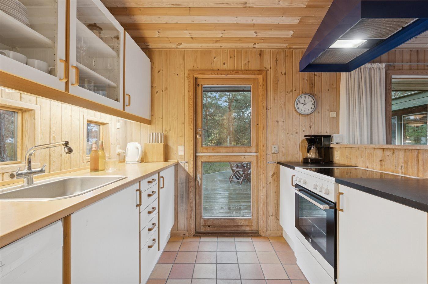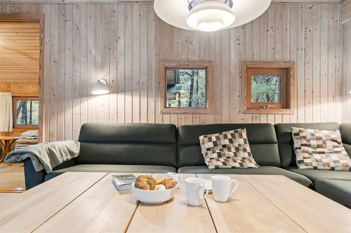Das Haus ist auf fast allen Seiten, von einer großen, schönen Holzterrasse umgeben, und es gibt auch eine herrliche überdachte Terrasse, auf der du die Abende in Ruhe genießen kannst, nachdem der Tau gefallen ist. Das Wohnzimmer und die Wohnküche sind hell und geräumig, mit einem schönen Essbereich, wo es für die ganze Familie Platz gibt.
