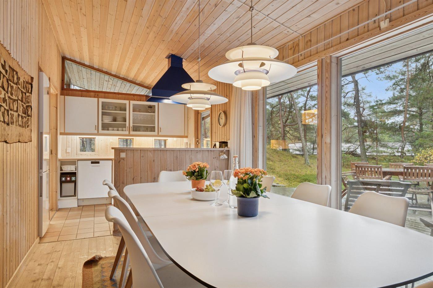 Auf einem kleinen Hügel im alten, heute von Kiefern bewachsenen Gebiet von Dueodde, liegt dieses besonders schöne Ferienhaus von hoher Qualität mit Platz für bis zu 8 Personen. Der Strand unterhalb des Hauses ist ikonisch und wurde von Lonely Planet zu einem der besten Strände Europas gewählt. Das Grundstück ist leicht hügelig, und eine Holztreppe führt zum Haus hinauf.